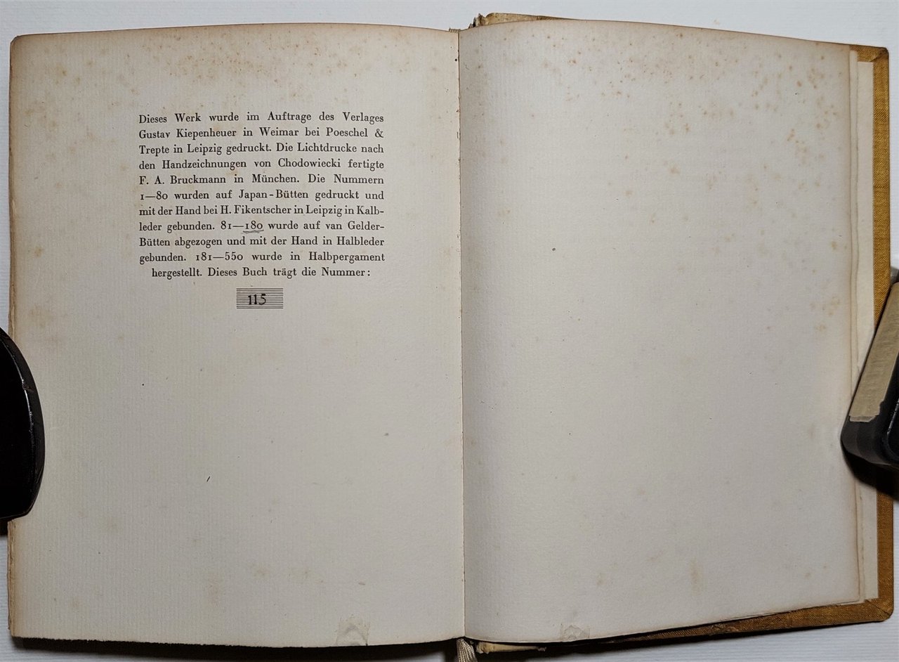 Questo lavoro Ë stato stampato da Poeschel & Trepte a Lipsia per conto della casa editrice Gustav Kiepenheuer a Weimar. I collotipi basati sui disegni di Chodowiecki sono stati realizzati da FA Bruckmann a Monaco. I numeri 1-80 sono stati stampati su carta vergata giapponese e rilegati a mano in pelle di vitello da H. Fikentscher a Lipsia. 81-180 Ë stato steso su carta vergata van Gelder e rilegato a mano in mezza pelle. -550 Ë stato realizzato in semipergamena. Questo libro porta il numero: 115