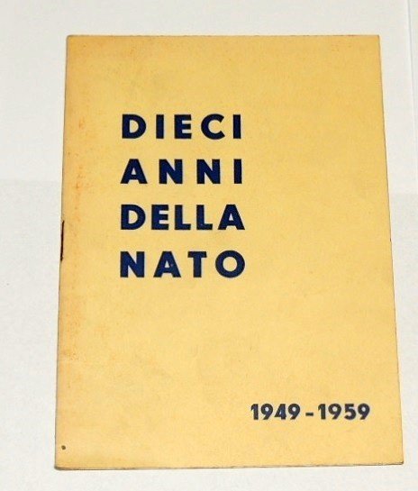 Dieci anni della Nato. 1949-1959, s.n., s.l. (ma stampato a Roma) s.d. (1959?), pp. 14 (non numerate), ill. col., cm 17. Opuscolo esplicativo sulle funzioni della Nato. Lievi mancanze al dorso.