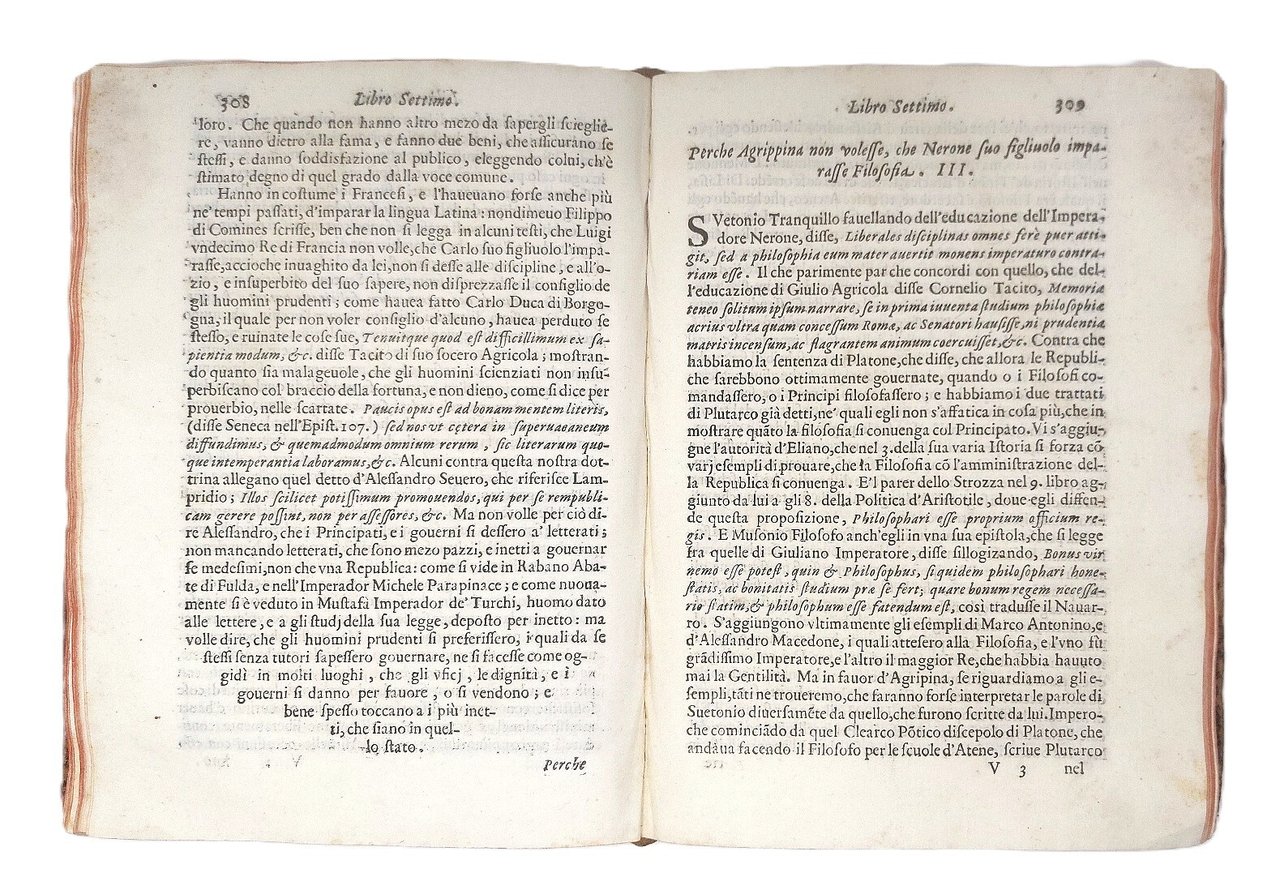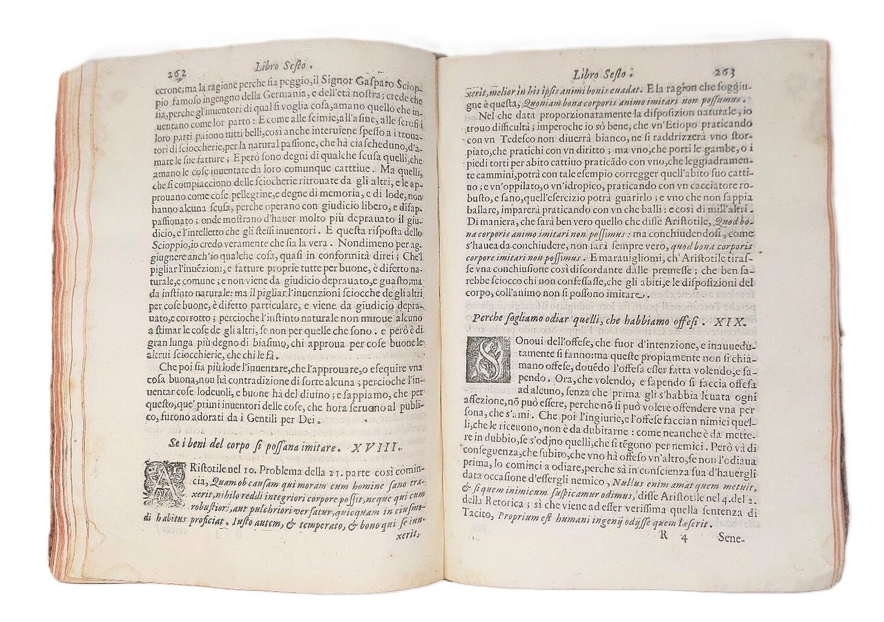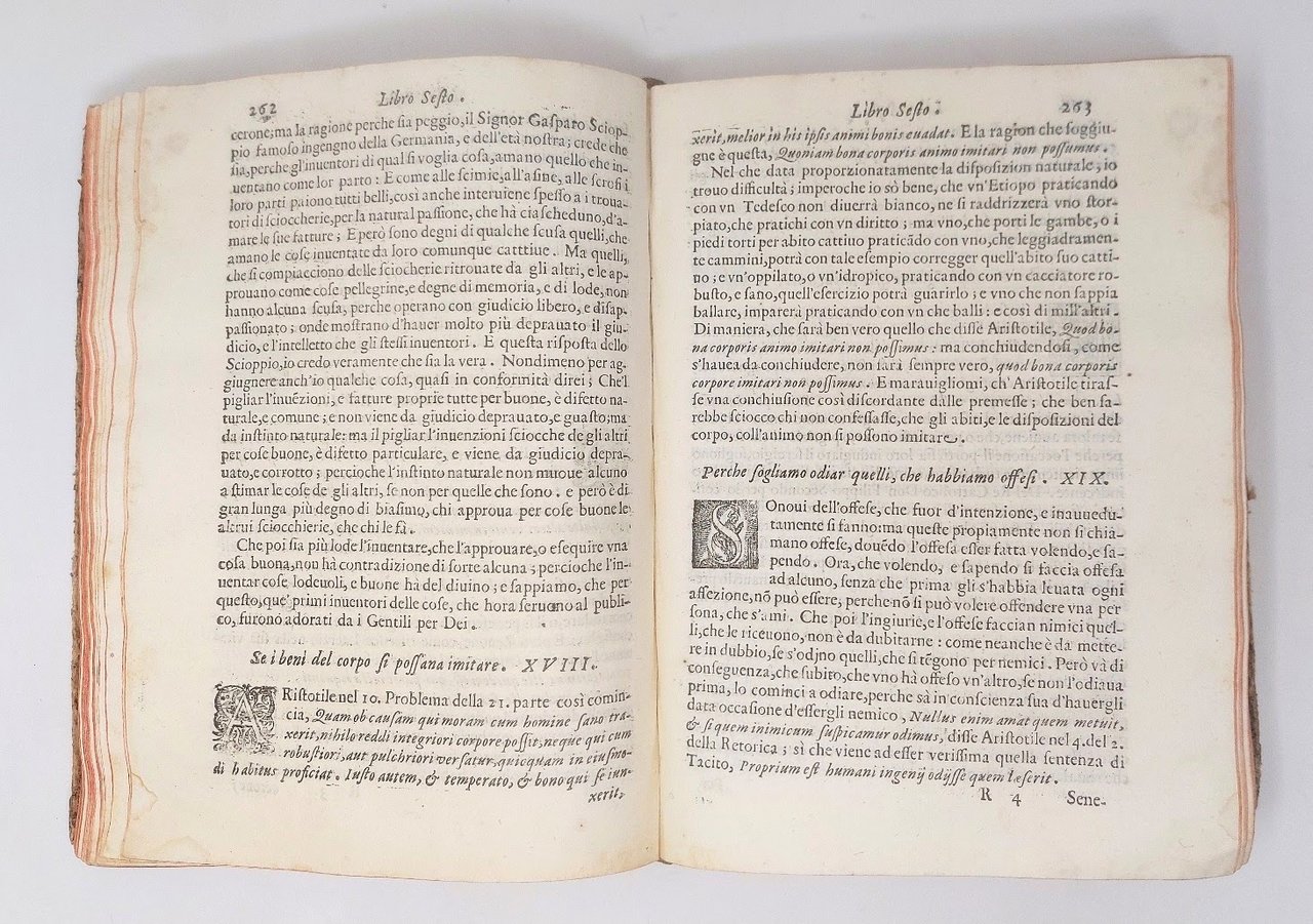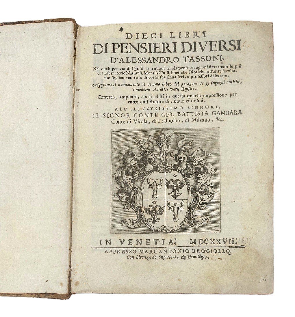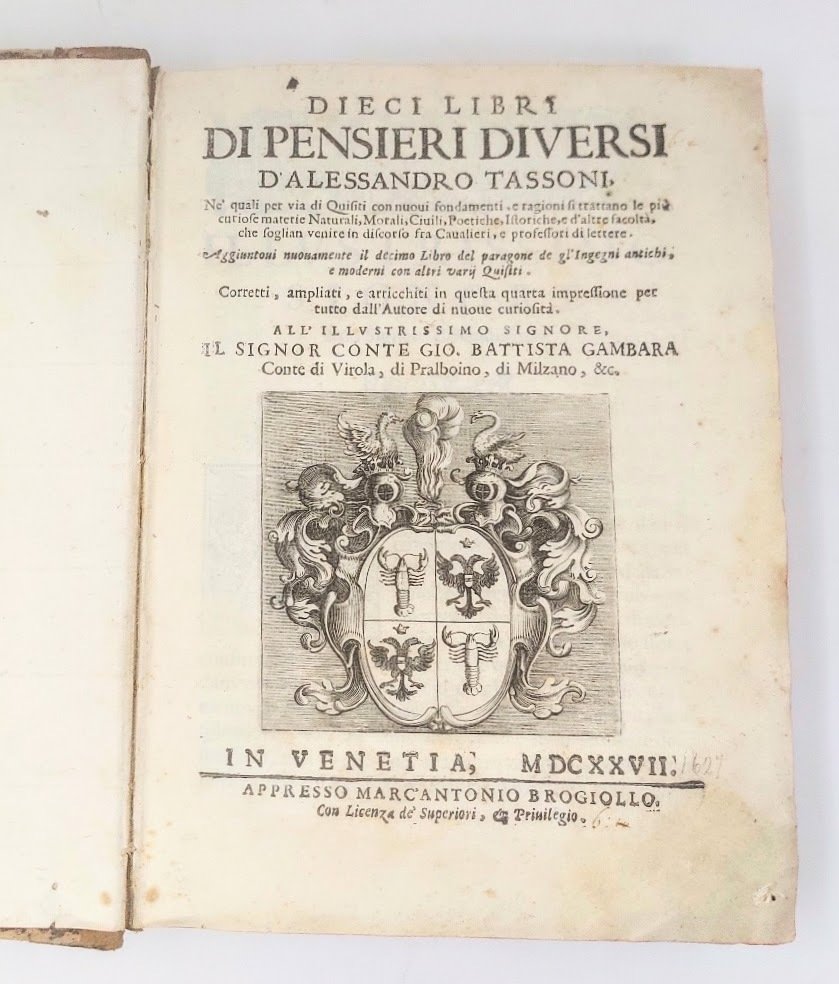 >in-4, pp. (96), 679, (1); leg. coeva m. pelle, tit. oro su tassello e fregi al dorso, tagli rossi. Armi nobiliari inc. sul tit., fregi ed un gran numero d'iniz. silogr. Dedica del Frambotti al conte Gio. Batt. Gambara. Edizione definitiva e testo di lingua registrato dal Gamba (la prima, apparsa nel 1608 e non riconosciuta dall'Autore, conteneva soltanto 151 quesiti). Famosa opera del Tassoni (Modena 1565-1635), e bizzarro zibaldone che contiene, accanto a meditazioni storico-filosofiche, una miniera di curiosità astrologiche, culinarie, sull'arte del cavalcare, la cosmografia (con un accenno alla scoperta dell'America), etc. Non vi compare il quesito "se il boia sia infame", non condiviso dal Tassoni (scomparso, infatti, dopo la prima edizione perché ritenuto audace e macabro, riapparirà nell'edizione del 1636). Assai interessanti gli argomenti del libro X intitolato "Ingegni antichi, e moderni". Bell'esemplare (qualche lieve brunitura marginale e piccolo lavoro di tarlo nell'ang. nei primi 6 ff. e nel margine infer. delle pp. 455-482). Gamba 2098. BMC, XVII sec., 896. Michel-Michel VIII, 30. Graesse VII, 40.