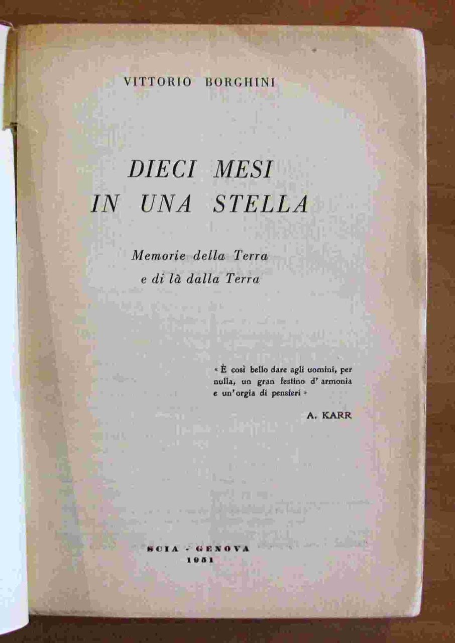 Editrice S.C.I.A. - Genova, 1951. Brossura editoriale con leggere tracce d'uso alla copertina. 13,5x20; pp.524. Ricordi e riflessioni moraleggianti di un uomo che guarda la Terra da un non meglio identificato pianeta. Buono stato. , Molto buono (Very Good)