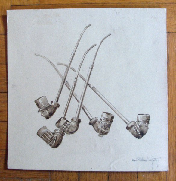 disegno all'acquarello originale e firmato di Santambrogio raffigurante una composizione di pipe formato 30X30 cm circa; Diego Santambrogio (Scafati 1898 - Milano 1969), illustratore per le riviste "Emporium" e "Il Dramma", fumettista per "Il Corriere dei Piccoli" e "La Domenica dei Fanciulli".