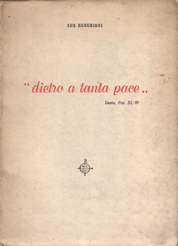 In-16° (cm 17,5x12,5), pp. 95, (1), copertina editoriale. Con 2 illustrazioni fotografiche in bianco e nero nel testo. Arrossature e bruniture alle pagine, dovute al tipo di carta. Indice: Prefazione. Parte prima. Di luce in luce. Laudato si', Misignore; . per sora aqua; . per sora luna e le stelle; . per frate vento; . per sora nostra morte corporale. Parte seconda. Quel padre e quel maestro. Nella fame e nella sete; Il frutto dell'albero; Per tua sola grazia.; Il nemico, cioé il corpo; Poveri di spirito; I segreti del Signore; Vedere Iddio; Per amor dell'amor tuo.:; Luce inaccessibile.