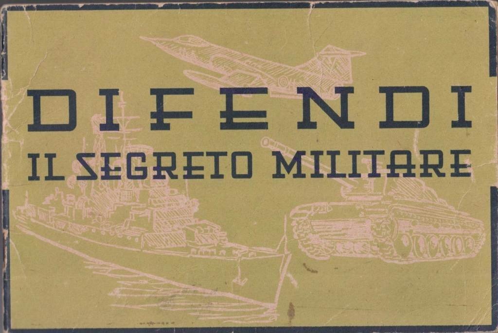 Difendi il segreto militare, s.n, s.l. s.d. (ma 1952 circa), pp. 31, ill. col., cm 14x21 (formato oblungo), rilegatura ed. a punto metallico. Data approssimativa ricavata da riferimenti presenti nel testo. Simpatico opuscolo illustrato destinato all’ambiente militare e finalizzato a mettere in guardia sull’importanza del rispetto del segreto militare. Tracce d’uso, ma comunque ben conservato.
