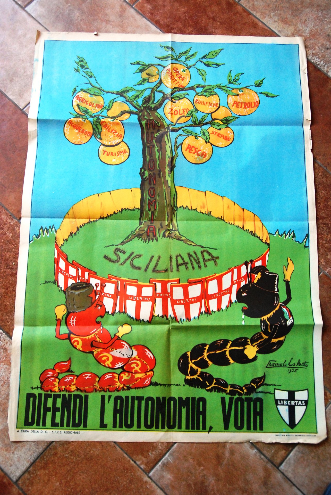 poster locandina manifesto politico pubblicitario formato grande difendi l'autonomia siciliana vota DC democrazia cristiana libertas carmelo lo porto. 1955 .