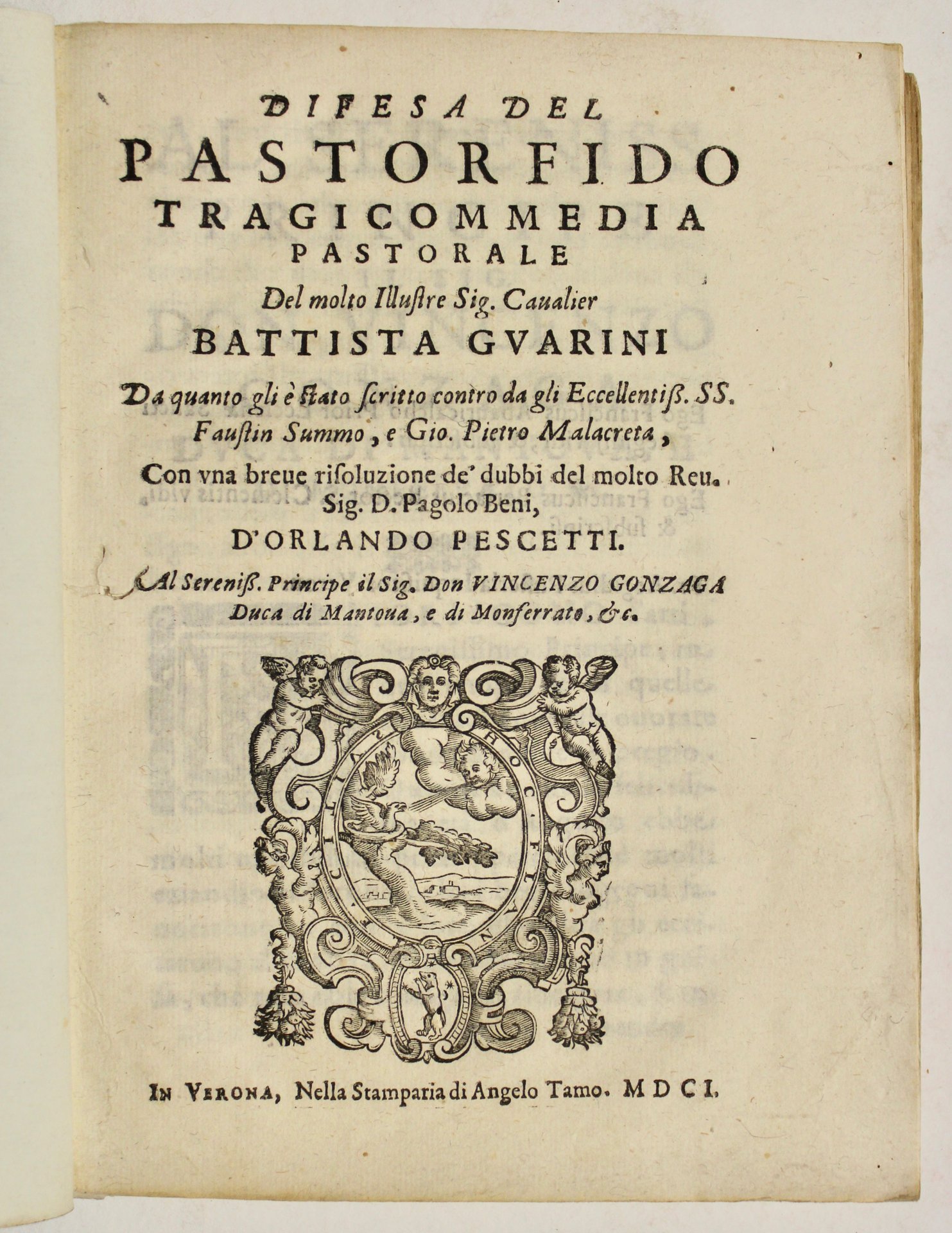 Tre parti in un volume di (mm 200x145), pagg. (16), 284.<BR>Marca editoriale in silografia ai tre frontespizi, alcuni graziosi capilettera xilografici. Legatura moderna in cartoncino verde muto.<BR>Esemplare ben conservato con ampi margini; presenta solo camminameto di tarlo dall'inizio del tomo, al margine int. fino a pag. 3 e poi piccolissima traccia che riprende da pag. 267 fino alla fine. Angolo est. brunito di una sola pag. 137 al marg. sup. Lieve alone marg. est. a poche pagg. alla fine.<BR>Rara prima edizione di questa appassionata apologia del "Pastor fido" guariniano contro i canoni rigidamente aristotelici dei suoi detrattori. La seconda parte (p. 105) intotolata "Risposta alle considerazioni o dubbi dell'Eccellentissimo Sig. Gio. Battista Malacreta, sopra il Pastor Fido"; la terza, (p. 257) "Scioglimento dei dubbi del M. R. Sig. D. Pagolo Beni mosso contra il Pastorfido nella sua risposta alle considerazioni dell'Eccellentiss. Sig. Dottor Malacreta Accademico Ordito". <BR>Orlando Pescetti (1556-1624), letterato nativo di Marradi (Firenze), svolse la professione di insegnante di grammatica a Verona in una singolare scuola sovvenzionata dal comune e di orientamento vivamente anticonfessionale. <BR>Cfr. Iccu; STC XVII Century, p. 476; Graesse, V, p. 217; Enciclopedia dello Spettacolo, VI, 2; non in Piantanida.<BR><BR>