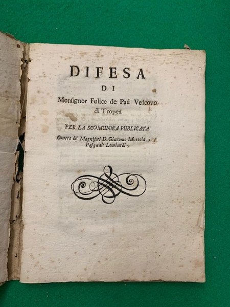 In 4°; (2 b.), 110 pp. Legatura coeva in cartoncino molle con tracce di sporco al piatto anteriore e qualche piccola mancanza al dorso. La legatura è allentata anche se all'interno il volume si presenta ben rilegato. Prima ed unica rara edizione, tre soli esemplari censiti in ICCU, di questa difesa contro la scomunica di Monsignor Felice de Pau (25 maggio 1703 - , della nobile famiglia di Paù. Appartenente all'accademia romana dell'Arcadia, sotto il nome di Anemo Micalesio, vi lasciò il segno per la sua produzione poetica e musicale di carattere pastorale. In campo musicale fu molto apprezzato come critico e banditore della riforma dell'opera già voluta dal Lulli. Celebre erano le rappresentazioni musicali o melodrammatiche da lui allestite in una sala appositamente attrezzata a teatro, ricavata nel suo palazzo di famiglia a Roma. Come vescovo fu abilissimo a rilanciare l'attività della sede episcopale di Tropea divenendo figura centrale del territorio. I fatti narrati e ricostruiti nella disputa, nascono sul controllo e sfruttamento delle acque in una zona nei dintorni di Birvadi in provincia di Ricadi. Molto raro. Paù fu un celebre esperto di diritto ecclesiastico. Rif. Bibl.: IT\ICCU\BA1E\010083.