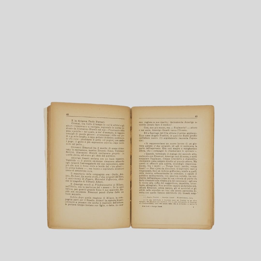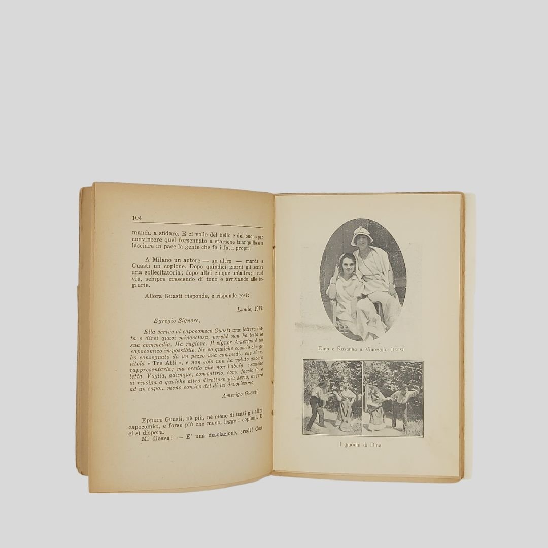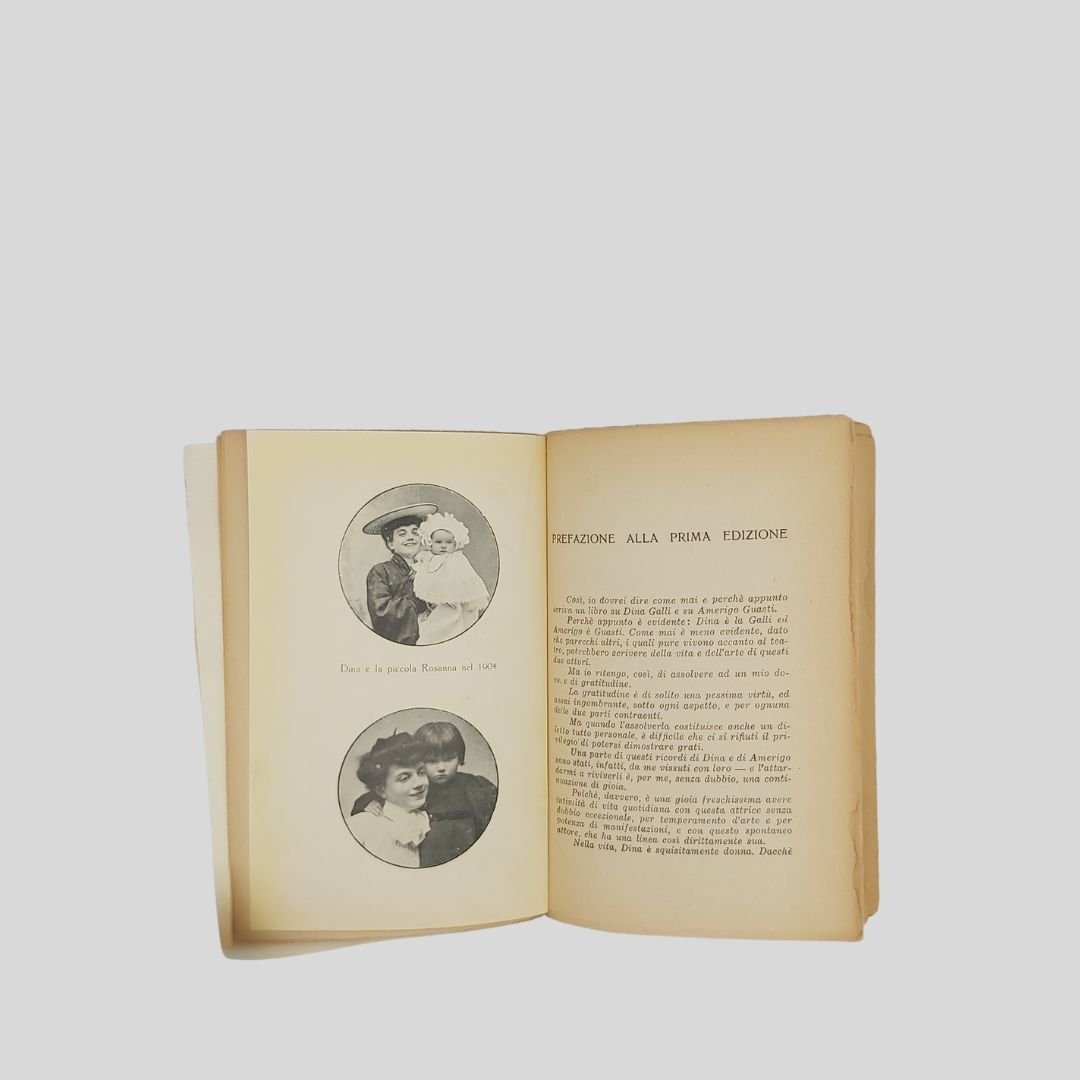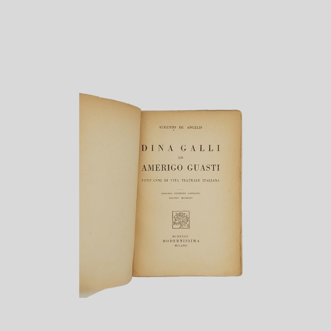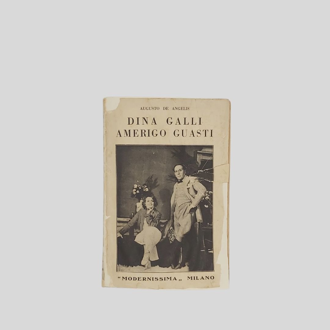 pp. 122. In-16° (cm 19,5), con numer. tavv. fotogr. f.t. Piccole mancanze alla copertina, rimontata, dorso allentato. Seconda edizione ampliata. Decimo migliaio. Dina Galli e Amerigo Guasti: I ricordi di due importanti esponenti del teatro italiano tra fine ‘800 e i primi del ‘900. Dall’indice: I primi passi di un’attrice milanese; Dina recita in italiano; Da mozzo ad attore; Dina ed Amerigo; Roma e Napoli; Il direttore, l’autore, l’attore; L’arte di Dina Galli.