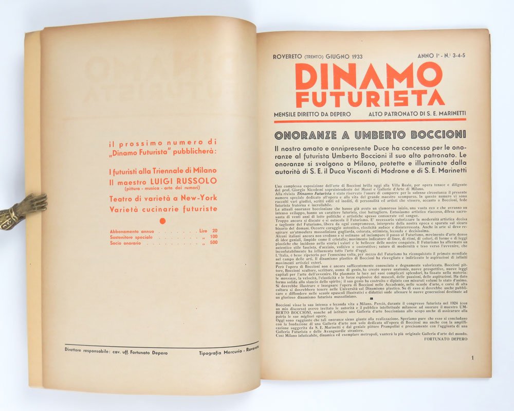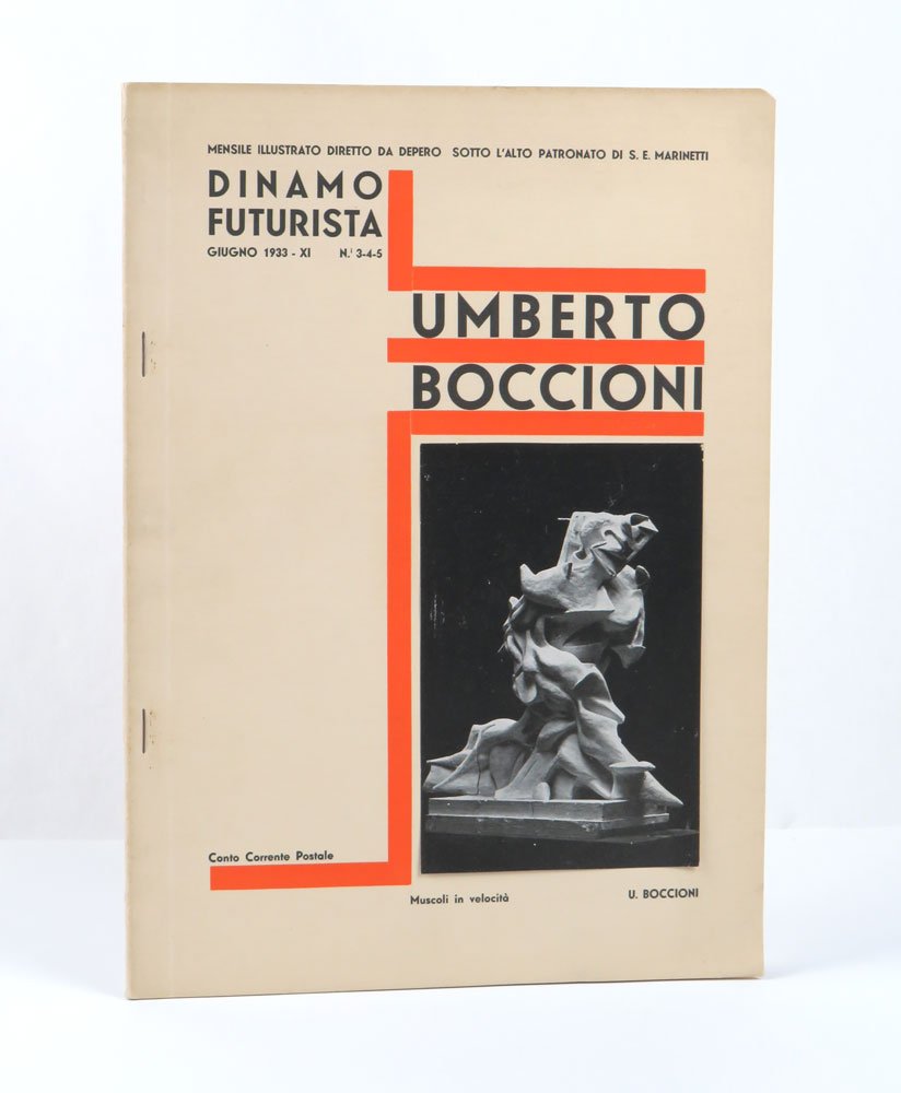 PERIODICOEdizione originale.Esemplare completo del rarissimo pergamino originale semitrasparente a proteggere la copertina. Brunito alla copertina e alle pagine interne, per il resto in condizioni più che buone quando non ottime.Numero 3-4-5 (giugno) del mensile diretto e curato graficamente da Depero, di cui è l’ultima uscita. Di formato e grafica diversa dai precedenti, tirato in un maggior numero di copie in occasione delle Onoranze nazionali a Umberto Boccioni organizzate dal Comune di Milano nelle giornate del 14-16 giugno 1933. -- Di elevatissima qualità grafica, contiene interventi originali di Marinetti (Il grido di Marinetti), Buzzi (la parolibera: Canzone di Boccioni e il testo Gloria a UB), Russolo, Notari, oltre a ripescaggi segnalati dalla stampa e scelte citazioni boccioniane. Due diagrammi disegnati da Depero, «La storia dell’arte suddivisa da Boccioni o nei seguenti periodi» e «Dall’impressionismo al futurismo», e una scelta iconografia di opere del maestro.Cammarota, Futurismo, Giornali fut., 118; Diz. Fut., pp. 385b-387b; Millefiorini, La pubblicistica futurista nei primi anni Trenta, ad indicem; Salaris, Riviste, pp. 198ss;