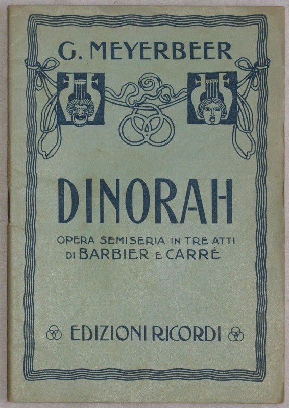 In 16. Dim. 18x13 cm. Pp. 32. Bel libretto d'opera dell'opera in tre atti "Dinorah" di Giacomo Meyerbeer su libretto di Jules Barbier e Michel Carrè. Senza data ma dei primi del '900. La prima rappresentazione ebbe luogo al Theatre National de l'Opera Comique il 4 Aprile 1859. In buone condizioni. Bella brossura editoriale illustrata. Brossura editoriale in buone condizioni generali con lievi usure ai margini e dorso. Legatura in buone condizioni. All'interno le pagine si presentano in ottime condizioni con rare fioriture. Beautiful booklet of the work in four acts "Dinorah" by Giacomo Meyerbeer on booklet by Jules Barbier and Michel carrè. Not dated but of the first years of 1900. The first representation took place in the Theatre National de l'Opera Comique the 4th of April 1859. In good conditions. Illustrated editorial cover. Editorial cover in good general conditions slightly worn in the edges and cracks in the spine. Binding in good conditions. Inside pages are in very good conditions with occasional foxings.