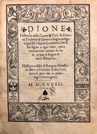 Dione. Historico delle Guerre & Fatti de Romani: Tradotto di Greco in lingua vulgare per M. Nicolo Leoniceno. Con le sue figure a’ ogni libro, opera nuovamente venuta in luce, ne più in lingua alcuna stampata.