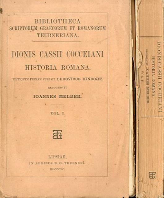 2 v. (XLIII, 604; 481 p.) ; 18 x 12 cm. Bibliotheca scriptorum Graecorum et Romanorum Teubneriana. Precede al titolo greco quello in latino «Historia romana». Testo dell'opera solo in greco. La «Storia romana» è un'opera in 80 libri scritta in greco nella prima metà del III secolo da Cassio Dione Cocceiano, storico e funzionario imperiale romano. Frutto di 10 anni di ricerche e altri 12 di lavoro di stesura, i libri coprivano un periodo di 983 anni, dallo sbarco mitico di Enea in Italia, la fondazione di Roma nel 753 a.C. fino al 229 d.C., ai tempi dell'Imperatore Alessandro Severo. Purtroppo, solo i libri dal 37 al 60 ci sono giunti integralmente, di altri conserviamo frammenti più o meno ampi, o epitomi di epoca bizantina. Questa edizioni è rimasta incompiuta, sono stati pubblicati solo i primi tre volumi, i primi due - quelli che proponiamo - sono stati editi nel 1890 e 1894. Brossura editoriale, coperta in carta. Segni del tempo alla coperta e al dorso (piccolo strappo al secondo volume), per il resto volumi integri. Codice libreria 6782.