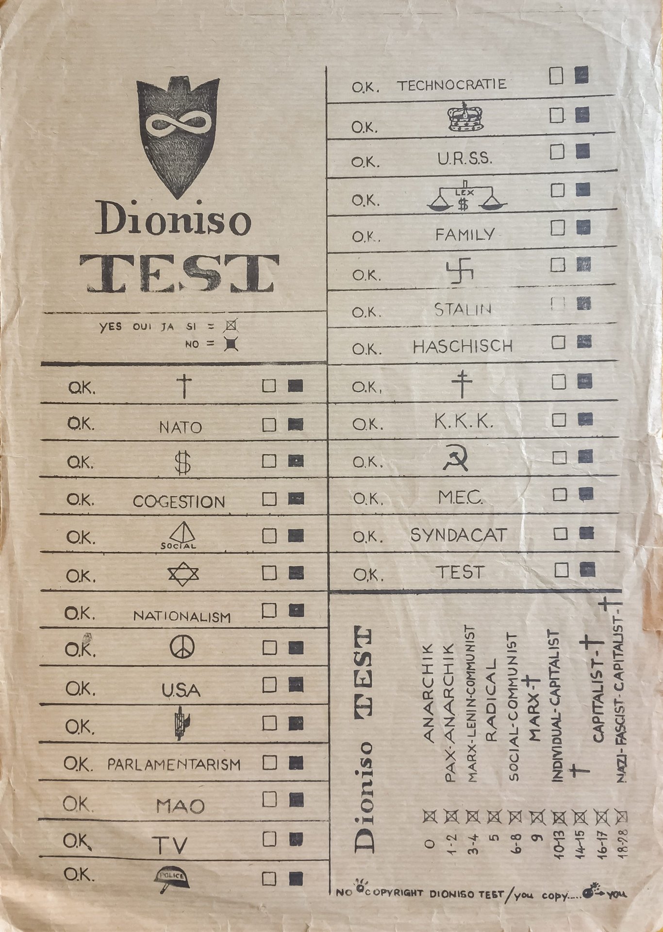 Test ludico e ironico in cui il dionisiaco viene associato al gradiente anarchico, più ce ne si allontana più ci si avvicina al capitalismo nazi-fascista! Stampato su carta da pacco, senza indicazione di data e luogo, minimi difetti ai margini.