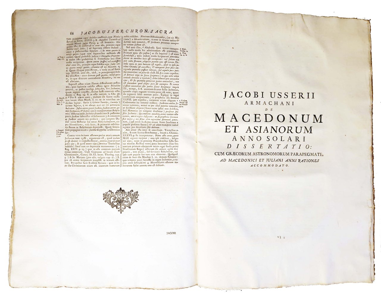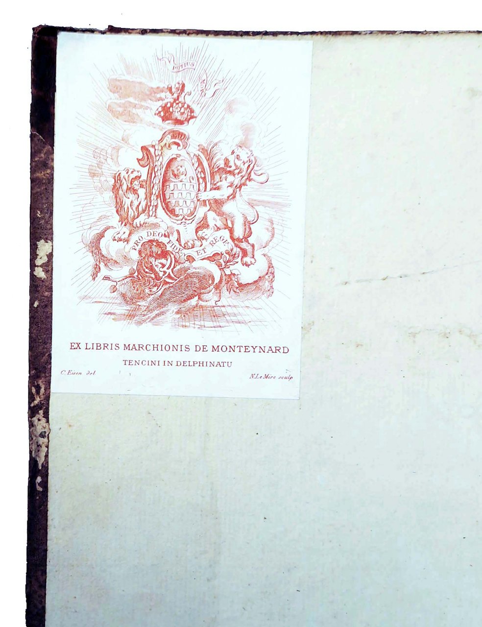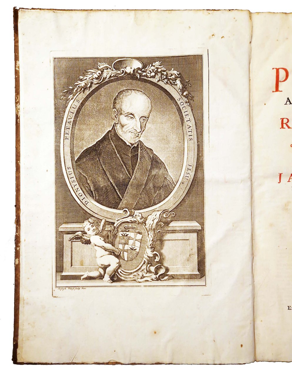in-folio, 432x290 mm, leg. in mezza pelle chiara con angoli e carta marmorizzata ai piatti, con decori in oro al dorso, titolo dorato su tassello in pelle color arancio al dorso; 2 parti legati in un volume; pp. [8], 196, [1] c.; 192; 8, 96. Front. stampato in rosso e nero con vignetta calcogr. firmata da Giuseppe Filosi. Ritratto calcogr. dell' A. eseguito da Giuseppe Filosi all'antiporta. Iniziali e testatine xilografiche. Testo su due colonne. Il testo principale, a cura di Denis Petau (1583-1652), è seguito da altre due opere, a cura di James Ussher (1581-1656), precedute ciascuna dal proprio occhietto, con titoli: [1.]: "Jacobi Usserii Armachani Chronologia sacra. Seu Annorum et paidopoiias patriarcharum, paroikias Israelitarum in Aegypto, annorum etiam judicum, regum Judæ & Israelis apodeixis chronologica. Opus posthumum hucusque anekdoton"; [2.]: "Jacobi Usserii Armachani De Macedonum et Asianorum anno solari dissertatio: cum graecorum astronomorum parapegmate, ac Macedonici et Juliani anni rationes accommodato". Prov.: Etichetta di provenienza incollata al contropiatto anteriore con scritte (ex libris Marchionis De Monteynard Tencini in Delphinatu. C. Eisen del. N. Le Mire sculp.) e incisione in colore rosso (due leoni su una nuvola che reggono uno stemma nobiliare coronato, motti: pro Deo fide et rege; potius mori). Marchese Luigi Francesco di Monteynard (1713-1791), è stato un generale e politico francese, nativo della regione del Delfinato. Nel 1759 divenne luogotenente generale, il grado militare più alto a quell'epoca, dopo quello di maresciallo di Francia. Nel 1771 fu chiamato da Luigi XV a sostituire il duca di Choiseul come Ministro della Guerra. Nel corso dei tre anni del suo mandato egli intraprese numerose iniziative per migliorare la situazione dei soldati. Per questo venne portato ad esempio per l'Europa nel Dictionnaire philosophique di Voltaire. Divenne anche il primo governatore generale della Corsica e creò a Saumur la scuola di equitazione che, dopo la rivoluzione, darà origine al celebre corpo di cavalieri detto Cadre Noir. Nel 1775 dette inizio alla costruzione del castello di Cruzille à Tencin, nel quale però non abitò mai. Rif.: IT\ICCU\UBOE\015206. OCLC, 799255736. Cond.: Segni d'uso alla legatura (rottura alla porzione superiore della cerniera posteriore, lunga circa 10 cm, abrasioni alla pelle e alla carta dei piatti). Carte spesse, croccanti, pulite, con rare macchie d'umido; testo molto marginoso. Nel complesso trattasi di un esemplare molto buono.