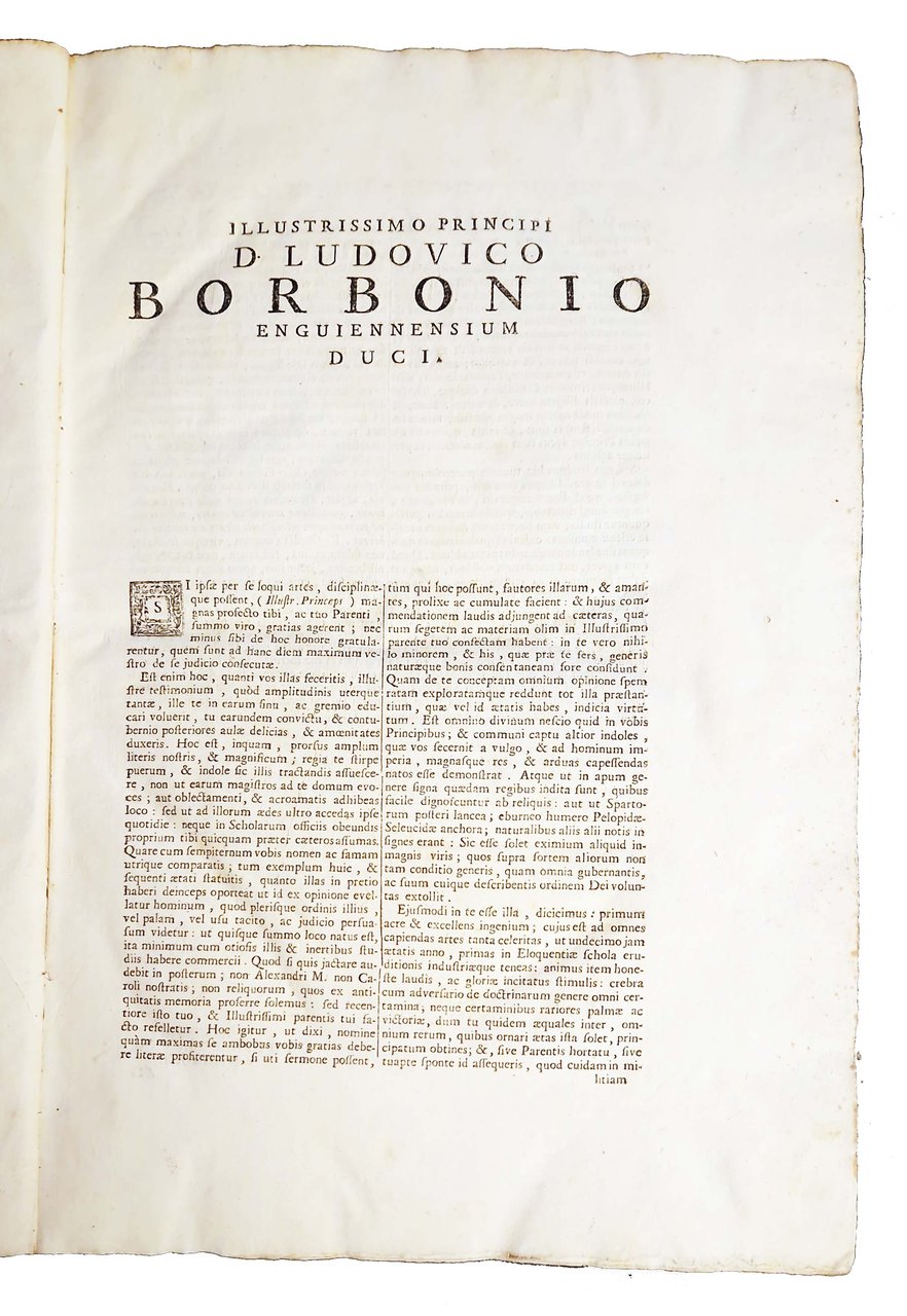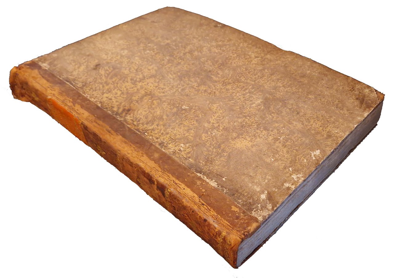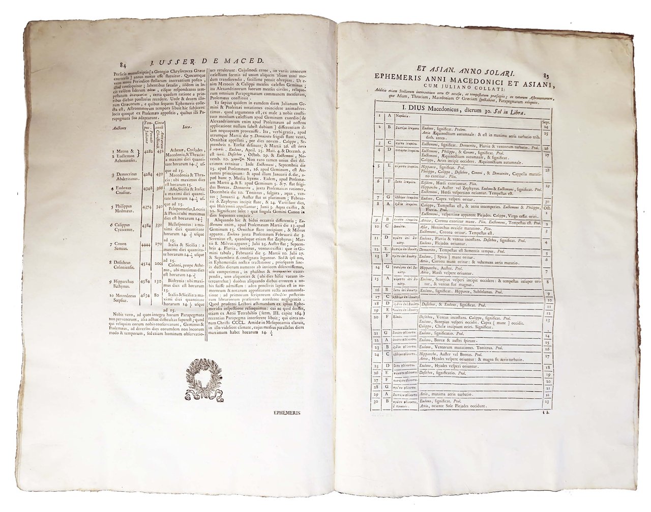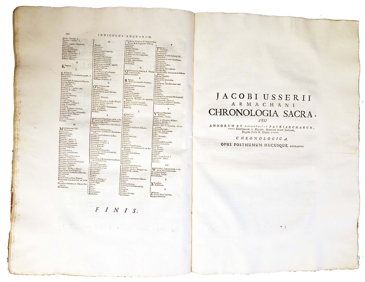 in-folio, 432x290 mm, leg. in mezza pelle chiara con angoli e carta marmorizzata ai piatti, con decori in oro al dorso, titolo dorato su tassello in pelle color arancio al dorso; 2 parti legati in un volume; pp. [8], 196, [1] c.; 192; 8, 96. Front. stampato in rosso e nero con vignetta calcogr. firmata da Giuseppe Filosi. Ritratto calcogr. dell' A. eseguito da Giuseppe Filosi all'antiporta. Iniziali e testatine xilografiche. Testo su due colonne. Il testo principale, a cura di Denis Petau (1583-1652), è seguito da altre due opere, a cura di James Ussher (1581-1656), precedute ciascuna dal proprio occhietto, con titoli: [1.]: "Jacobi Usserii Armachani Chronologia sacra. Seu Annorum et paidopoiias patriarcharum, paroikias Israelitarum in Aegypto, annorum etiam judicum, regum Judæ & Israelis apodeixis chronologica. Opus posthumum hucusque anekdoton"; [2.]: "Jacobi Usserii Armachani De Macedonum et Asianorum anno solari dissertatio: cum graecorum astronomorum parapegmate, ac Macedonici et Juliani anni rationes accommodato". Prov.: Etichetta di provenienza incollata al contropiatto anteriore con scritte (ex libris Marchionis De Monteynard Tencini in Delphinatu. C. Eisen del. N. Le Mire sculp.) e incisione in colore rosso (due leoni su una nuvola che reggono uno stemma nobiliare coronato, motti: pro Deo fide et rege; potius mori). Marchese Luigi Francesco di Monteynard (1713-1791), è stato un generale e politico francese, nativo della regione del Delfinato. Nel 1759 divenne luogotenente generale, il grado militare più alto a quell'epoca, dopo quello di maresciallo di Francia. Nel 1771 fu chiamato da Luigi XV a sostituire il duca di Choiseul come Ministro della Guerra. Nel corso dei tre anni del suo mandato egli intraprese numerose iniziative per migliorare la situazione dei soldati. Per questo venne portato ad esempio per l'Europa nel Dictionnaire philosophique di Voltaire. Divenne anche il primo governatore generale della Corsica e creò a Saumur la scuola di equitazione che, dopo la rivoluzione, darà origine al celebre corpo di cavalieri detto Cadre Noir. Nel 1775 dette inizio alla costruzione del castello di Cruzille à Tencin, nel quale però non abitò mai. Rif.: IT\ICCU\UBOE\015206. OCLC, 799255736. Cond.: Segni d'uso alla legatura (rottura alla porzione superiore della cerniera posteriore, lunga circa 10 cm, abrasioni alla pelle e alla carta dei piatti). Carte spesse, croccanti, pulite, con rare macchie d'umido; testo molto marginoso. Nel complesso trattasi di un esemplare molto buono.
