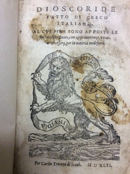 In-16 p. (mm. 151x90), p. pergamena antica (risg. rifatti), dorso a cordoni con fregi oro e titolo a secco, 310 cc.num., 14 cc.nn., due diverse marche tipografiche xilografate al frontespizio e in fine. "Prima edizione della versione italiana" dell'opera del medico greco Dioscoride (1° sec. d.C.). La sua opera "Sulla materia medica", un trattato completo di farmacologia, esercitò grandissima influenza nel campo farmaceutico e medico fino ai tempi moderni. Il sesto libro contiene de li mortiferi veleni e di loro previdenza e cura e de li velenosi animali. Il volgarizzamento particolarmente accurato è opera del celebre umanista Sebastiano Fausto da Longiano. Cfr. Pritzel, 2315 - Durling,1159 - Wellcome,1798 - Manca all'Adams. Con antiche postille a penna sulla prima carta bianca e alla fine (al margine dell'Indice); macchia al frontesp. restaur.; macchietta margin. su 4 cc., ma complessivam. ben conservato.
