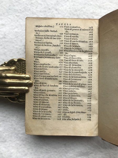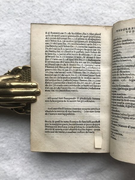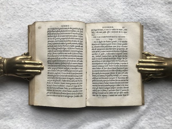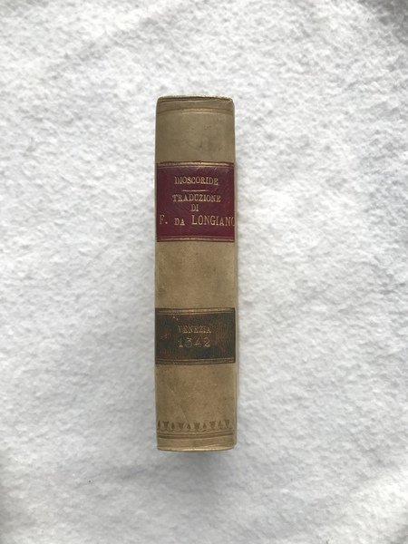 PRIMA EDIZIONE. In-8, 310 c. e solo 13 di 14 c n.n. finali: manca l'ultima carta con la conclusione della tavola dei contenuti e la marca al verso (uomo trifronte coronato) con nota tipografica. Carattere corsivo, un poco di romano. Piccole lettere guida e capilettera istoriati. Bella insegna dello stampatore al frontespizio con leone rampante che tiene un nastro tra gli artigli, in basso un drago con la testa recisa. Legatura di fine '800, o primissimo '900, in tutta pergamena, titoli in oro su doppio tassello (marocchino rosso e verde). Nonostante la mancanza finale, una copia molto buona, fresca e pulita all'interno. Prima ed unica edizione cinquecentesca di questa traduzione italiana cavata dal greco per le cure dell umanista romagnolo Sebastiano Fausto da Longiano. L'opera "Peri hules iatrikes", poi tradotta in latino come "De materia medica" , fu una farmacopea estremamente celebre nell'antichità, compilata dal medico, viaggiatore, soldato, e botanico greco Dioscoride Pedanio. Assieme alle opere di Galeno ed Ippocrate, quest'importante lavoro fu una delle fonti più autorevoli ed utilizzate per la preparazione di ricette mediche a partire dal cosiddetto rinascimento della medicina greca, avvenuto tra quattro e cinquecento, fino a tutto l'ottocento. La farmacopea di Dioscoride contiene informazioni sulle piante, gli animali e le pietre in relazione alle loro proprietà farmacologiche e alle sostanze, chiamate "semplici", derivate dalla lavorazione dei materiali organici. Contiene anche preziose informazioni sulle caratteristiche biologiche delle piante ed erbe e sul modo di riconoscerle, nonché quando, dove trovarle e come prepararle. Un altro grande traduttore dal greco al latino, e dal latino all'italiano, del "De materia medica" fu il celebre Pietro Andrea Mattioli, che fornì la sua traduzione di un preziosissimo e stimatissimo commentario, per la prima volta pubblicato in volgare italiano nel 1544. Pritzel, 2315; Durling,1159; Wellcome,1798.