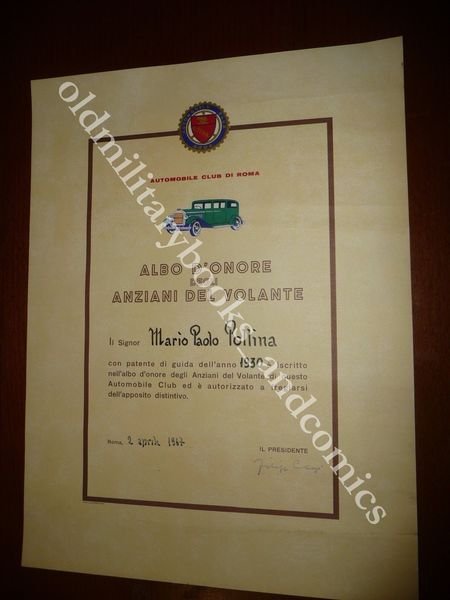 DIPLOMA ALBO D'ONORE DEGLI ANZIANI DEL VOLANTE ACI DI ROMA PER 37 ANNI PATENTE