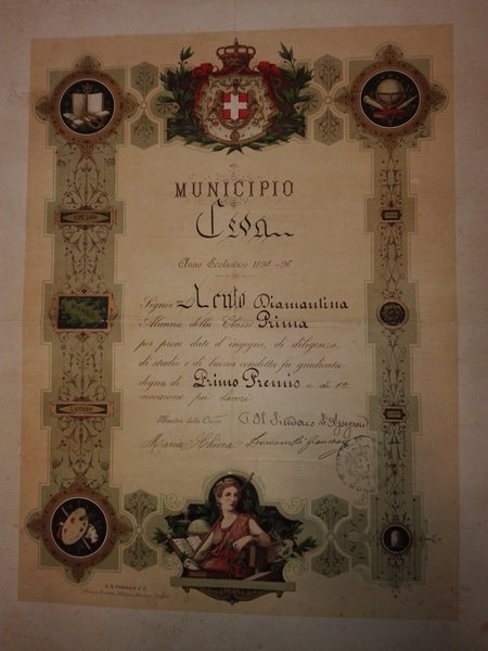 Diploma di Primo Premio per prove date d'Ingegno, Diligenza, Studio e Buona Condotta e di 1a Menzione. Anno Scolastico 1895-96.