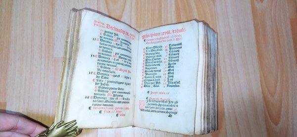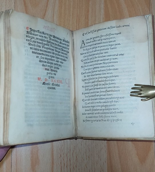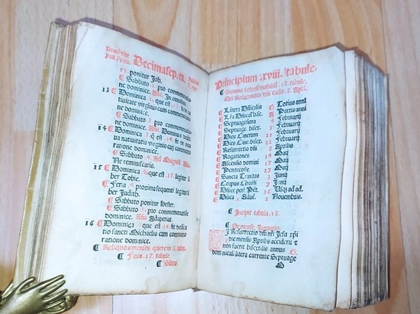 DIRECTORIUM DIVINORUM OFFICIORUM IUXTA ROMANANAE CURIAE RITUM, PER LUDOVICUM CICONIOLANUM REGULARIS OBSERVANTIE PROVINCE CAMPANIE EDITUS. ET PER DOMINUM PAULU TERTIUM PONTEFICES MAX. APPROBATUM. OMNIBUS PERUTILE, ET NECESSARIUM. IN QUO CONTINENTUR EE, QUAE SEQUENS PAGELLAE FERIES INDICAT. Romae, Ant. Badum Asulanum. Mense Octobri Exactum 1539. [Blado-rarissimo] (cm.14,5) buona piena pergamena sec. XVII Titolo manoscritto al dorso. -- cc. 10 nn., cc. 176 nn., cc. 101, cc. 8 nn. Frontis rosso e nero, entro bella cornice xilografica. Eleganti caratteri gotici, capilett. rossi in xilografia. Tutto il testo Ë in rosso e nero. Opera di eccezionale rarit‡. Manca addirittura al FUMAGALLI-VACCARO " EDIZ: di A. BLADO" e all' ASCARELLI " CINQUECENTINE ROMANE ". I dati tipografici sono a carta 101( mal numerata 41). DopodichË manca una carta bianca. Qualche lieve tarletto e leggero alone ma accettabile per l' assoluta rarit‡. Buon esemplare di grande belleza tipografica. -- solo in BRITISH M. STC. p. 383. ICCU registra nel CENSUS solo 2 copie eswistenti nelle biblioteche italiane.[f22]