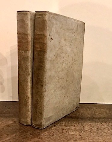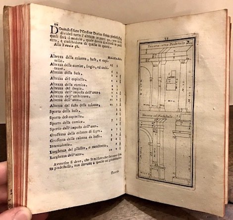 8vo (cm. 18,5), 2 Voll., 6 cc.nn., 143(1) pp. con 75 tavv. incise su rame f.t.; 144 pp., 56 (i.e. 58) tavv. incise su rame f.t. (di cui 18 ripiegate). Iniziali e fregi xilografici n.t. Legature coeve in pergamena rigida con titolo oro su tassello dipinto al ds. Tagli rossi. Ex libris di collezione privata ai contropiatti. Note di appartenenza cassate sulla carta di guardia libera anteriore del secondo vol. Minime sporadiche arrossature, peraltro esemplare in ottimo stato di conservazione. Cicognara (n. 432): ‘Lasciando a parte il gusto ornamentale di questo artista relativo all’epoca in cui viveva, li suoi trattati sono ben ordinati ed espressi, e le tavole di questa piccola edizione sono nitidamente intagliate in finissimi, e precisi contorni.’; Fowler, 135.