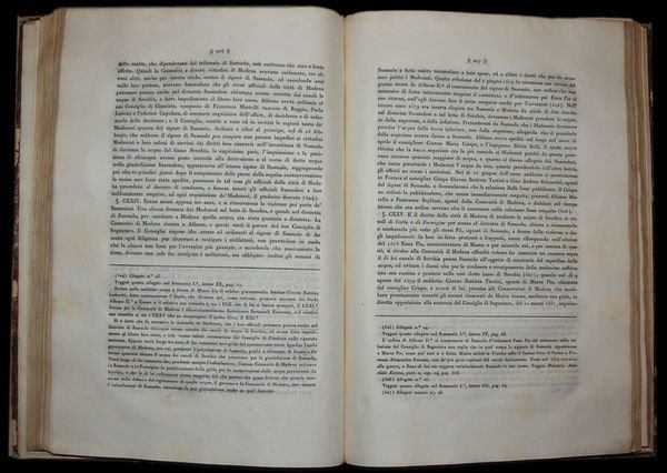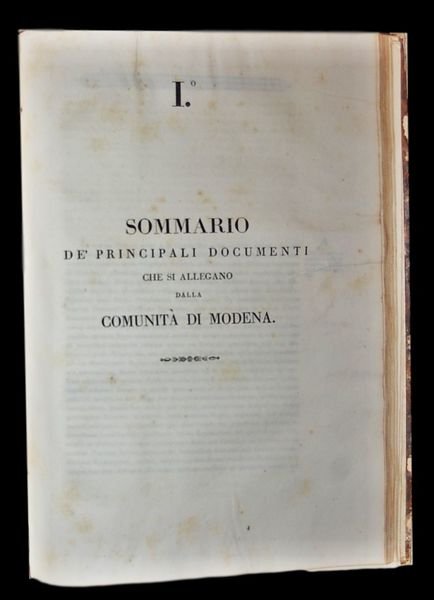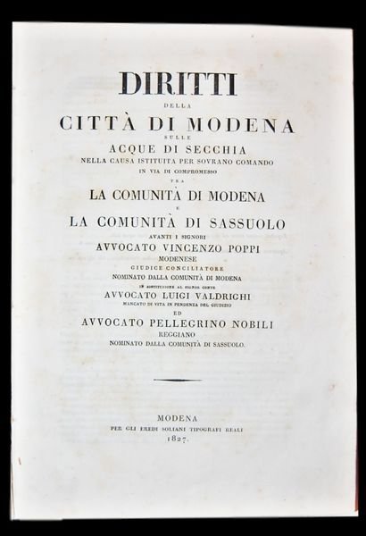 35,2x24 cm; (6), 273, 84,14, (2) pp. Legatura editoriale in mezza tela marrone (moderna) con piatti rivestiti in carta marmorizzata ottocentesca. Rinforzo al margine interno bianco delle prime due carte. In 2°; (2), 278, 84, 14 pp. Legatura coeva in mezza tela con piatti foderati da carta marmorizzata coeva e dorso con rinforzo novecentesco. Opera stampata su carta di ottima qualità. Bello stemma xilografico della città di Modena alla prima carta di sguardia entro cornice xilografica. Causa intentata dalla città di Modena nei confronti di Sassuolo per rivendicare i diritti sulle acque del fiume Secchia. Le parti in causa erano rappresentate rispettivamente dall'avvocato Vincenzo Poppi e dall'avvocato Pellegrino Nobili. L'opera si apre ricostruendo la storia dei diritti delle acque del fiume Secchia nel corso dei secoli fino alla data della causa con le controversie già insorte fra Modena e gli altri territori della regione come quella celebre con Reggio-Emilia. All'interno il volume si presenta con ampi margini e dalla carta bianca e forte. L'opera è una delle principali fonti per la ricostruzione dei diritti sulle acque del Secchia. A parte il rinforzo al dorso, in tela, l'esemplare si presenta in buono stato di conservazione.