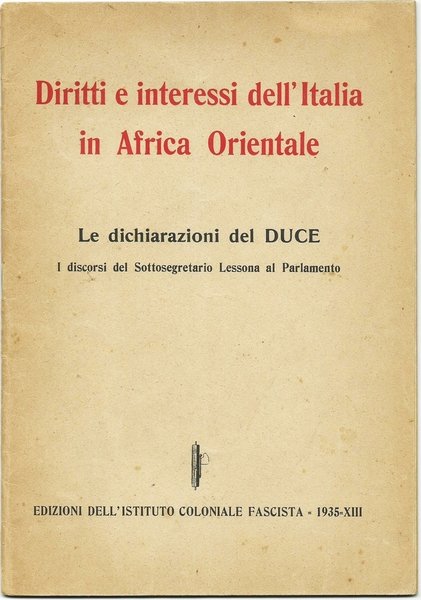 17,5x24,5; pp.31. Brossura editoriale. Contiene le dichiarazioni del Duce e i discorsi del Sottosegretario Lessona al Parlamento. Buonissimo stato. , Molto buono (Very Good)