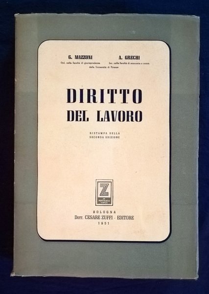 Un volume, 244x168 mm, leg. in brossura editoriale; pp. 507, [1]. L'opera comprende due parti: Parte I: Il diritto del lavoro in generale. I soggetti - I rapporti di lavoro. Prof. Giuliano Mazzoni. Parte II: Della previdenza sociale (le assicurazioni sociali). Prof. Aldo Grechi. Rif.: IT\ICCU\URB\0282864. Cond.: Segni d'uso alla legatura (brunitura al dorso, piccole pieghe e strappetti marginali). Lievi bruniture marginali alle carte. Opera in condizioni generali molto buone.