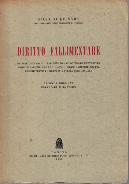 Giorgio De Semo, Diritto Fallimentare. Principii generali, fallimento, concordato preventivo, amministrazione controllata, liquidazione coatta amministrativa, reati in materia concursale.