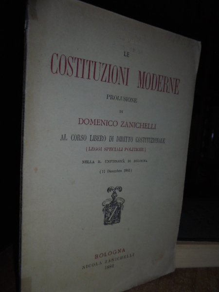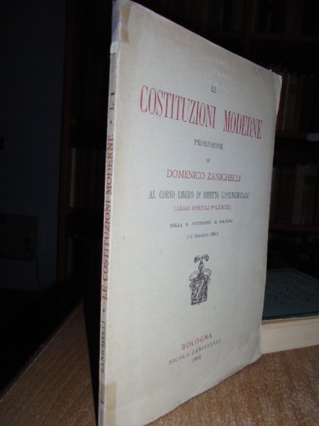 (Diritto-Politica) Zanichelli, Domenico. Bologna, Ivi, N. Zanichelli, 1884. Le costituzioni moderne. Prolusione. (Leggi speciali politiche), nella R. Università di Bologna. In-8°, br., orig. (4), 74 pp. In ottimo stato di conservazione. Neg. mob. 3