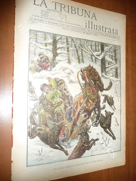 DESCRIZIONE: La Tribuna Illustrata, Roma, Anno XI n. 12 (22 Marzo 1903). COPERTINA: "Un uomo crudele assalito dai lupi in Russia" (ill. sconosciuto). RETRO: "Il disastro ferroviario sul ponte Previtolo (Roma-Napoli)" (ill. sconosciuto). INTERNO: "Un marinaio colpito dal fulmine a Napoli" (foto b/n). La Tribuna illustrata fu un settimanale italiano pubblicato a Roma. Fondato nel 1890 come supplemento del quotidiano La Tribuna, il primo numero uscì il 6 gennaio. Il formato della rivista era 27x38 cm e ogni numero conteneva 16 pagine. In breve tempo divenne il primo settimanale illustrato italiano. Nella prima metà del XX secolo, rivaleggia con il settimanale del Corriere della Sera, La Domenica del Corriere. CONDIZIONI: Buone. Non spillato, prov. da rilegatura. PESO / WEIGHT: 150 gr. without package