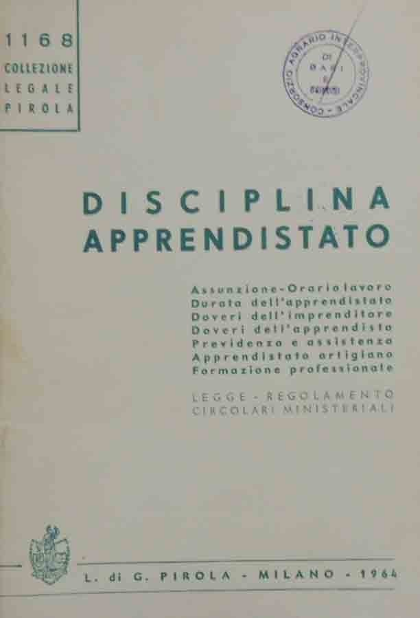 Disciplina apprendistato. Assunzione, orario lavoro, durata dell’apprendistato, doveri dell’imprenditore, doveri dell’apprendista, previdenza e assistenza, apprendistato artigiano, formazione professionale. Legge, regolamento, circolari ministeriali, L. di G. Pirola, Milano 1964, pp. 64, cm 22, pubblicazione spillata. Collana Collezione legale Pirola, n. 1168. Timbro di biblioteca estinta alla prima di copertina. Leggere tracce d’uso, minima ingiallitura della carta, per il resto ben conservato.