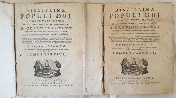 Edizione Zatta del 1782 di questo commento al Nuovo Testamento dello storico religioso e avvocato Claude Fleury (1640-1723). Annotazioni e dissertazioni a cura del gesuita Francesco Antonio Zaccaria (1714-1795). Nel 1745 succedette a Muratori. L'opera era composta da tre tomi, purtroppo il primo è mancante. Risultano inoltre mancanti le pagine dalla 233 alla 240 del terzo tomo. Bella incisione ad inizio capitolo. In discrete condizioni. Copertina cartonata coeva con titolo manoscritto al dorso in discrete condizioni con usure ai margini e dorso. Legatura in discrete condizioni con rotture. Pagine in buone condizioni con fioriture. In 8. Dim. 26x19,5 cm. Pp. IV+260, IV+304. Zatta edition of 1782 of this comment to the New Testament by the hystorian religiousman and lawyer Claude Fleury (1640-1723). Notes and dissertations by the jesuit Francesco Antonio Zaccaria (1714-1795). In 1745 he succedeed to Muratori. Thr work was made up of three tomes, the first one lacks. Pages from 233 to 240 of third tome lack. Beautiful engraving at the beginning of the chapter. In fair conditions. Carton coeval cover with handwritten title in the spine in fair conditions with wearings in the extremities. Binding in fair conditions with cracks. Pages in good conditions with foxing. In 8. Dim. 26x19,5 cm. Pp. IV+260, IV+304.