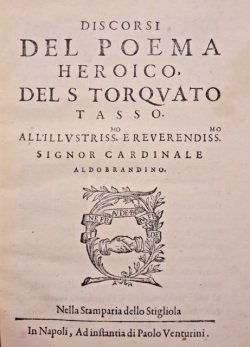2 volumi in 1 in-4° (cm. 21), elegante legatura del XIX secolo in m. pelle rossa e angoli con titolo e decorazioni in oro al dorso e piatti marmorizzati (lievi abrasioni), risguardi marmorizzati; cc. [4] 179 [1]; pp. [4] 71 [1b] in buono stato, qualche fioritura. La prima opera è un ampliamento dei Discorsi dell'arte poetica (Venezia 1587) da parte dell'autore stesso, mentre la seconda opera è qui in prima edizione e fu successivamente ristampata con diverso titolo (Il Conte o vero de l'imprese). Qui Tasso «denied [.] that God and the angels were the first inventors of the device» [Praz 59]. Cfr. Gamba 971; Praz 512. Esemplare molto buono. (SB6)