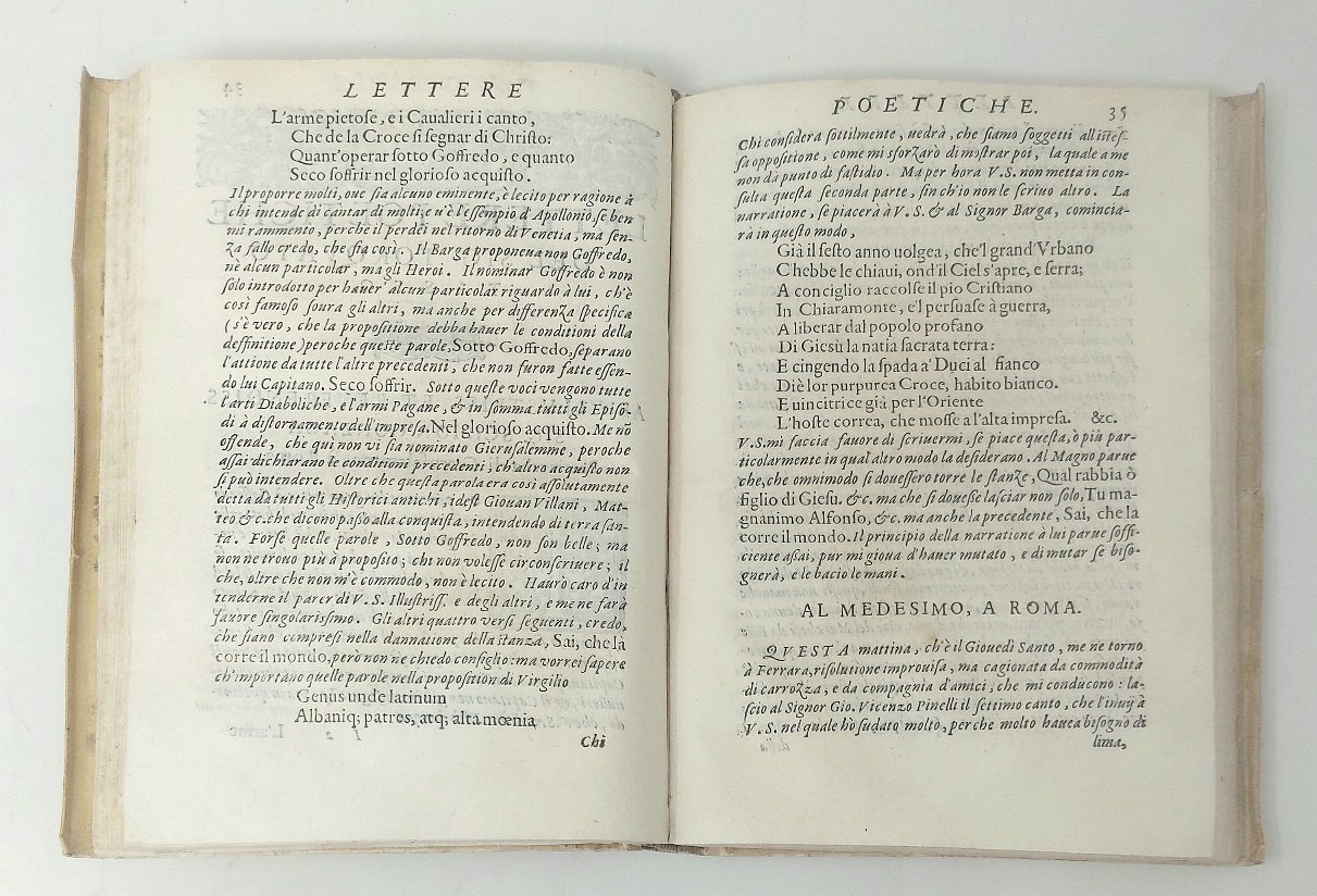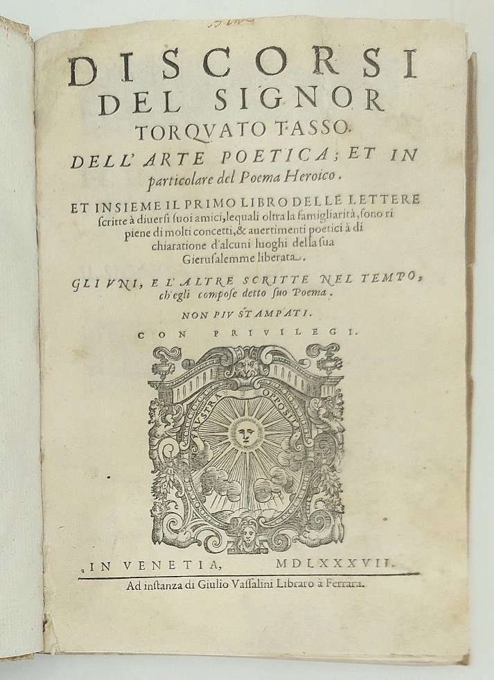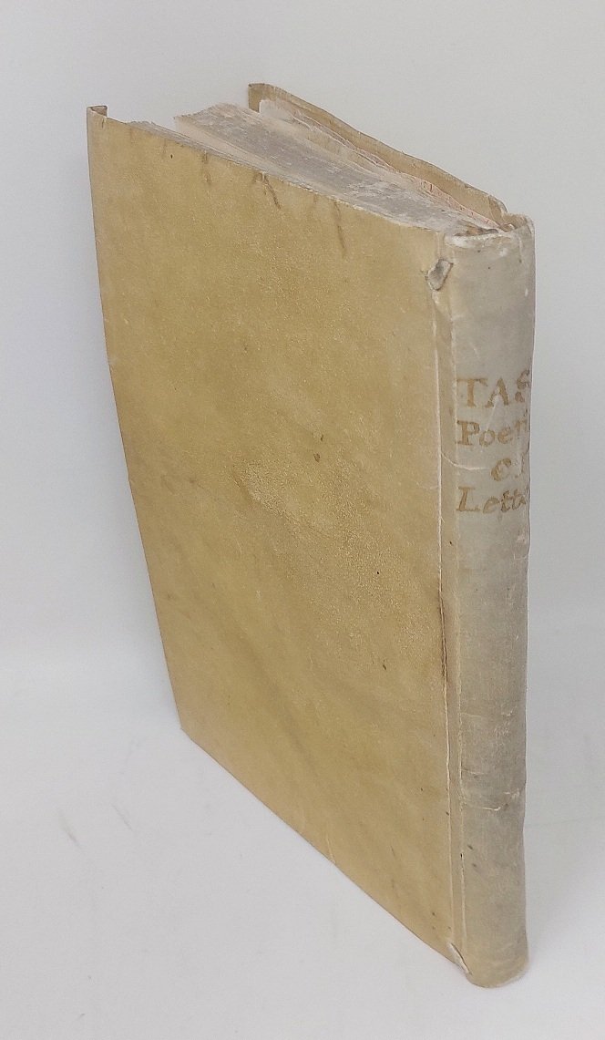>in-4, (192x134) ff. (4), 108, leg. coeva piena pergamena floscia con unghie, titolo ms. al dorso. Impresa del Vassalini sul titolo, testatine, fregi ed iniz. silogr. Testo in . tondo per i "Discorsi", in corsivo per le "Lettere". Dedica di Giov. Batt. Licinio a Scipione Gonzaga, patriarca di Gerusalemme. Prima edizione di questo trattato di estetica e di poetica, composto e "meditato" durante il primo periodo di creazione della "Gerusalemme Liberata" e, secondo il Solerti, letto all'Accademia Ferrarese non oltre il 1570. "Da essi, che trattano i tre punti della materia: invenzione, disposizione ed elocuzione, si detraggono i criteri dell'epica tassesca circa il contenuto che deve esser verosimile, meraviglioso, possibilmente a sfondo religioso, unitario e, quanto alla forma, strettamente aderente al concetto..." (Renda-Operti, Diz. storico della letteratura ital. p. 1127). La seconda parte del vol. contiene oltre quaranta "Lettere poetiche" del Tasso, per lo più a Scipione Gonzaga, e ad altri personaggi del tempo, tra cui Orazio Ariosto, Luca Scalabrino e Orazio Lombardelli, ed una lettera lunghissima (ff. 91-97) di quest'ultimo al Tasso. Esemplare fresco, con piccoli restauri al margine superiore interno del frontespizio e un alone ai primi 3 fogli. Tassiana Bergamo, n.29. Gamba 971, note. BMC 660. Adams T-228.