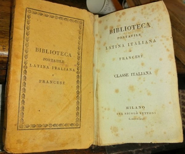 In-24 (14 cm) 2 voll VI 238; 215. Occhietto con titolo: "Biblioteca portatile latina italiana e francese" Classe italiana. Milano: er Niccolò Bettoni, 1821". Brossura editoriale, con mancanze ai dorsi e piatto anteriore del primo volume assente. Varie fioriture.