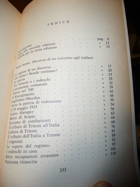 DESCRIZIONE: Edizioni LINT Trieste II^ Ed. III^ Ristampa 1979 br. ed. pp. 234 in 8°. Bel vol. che tratta di tutte le problematiche della terra triestina dal 1918 alla data di stampa. Gli esuli gli sloveni, i nostalgici della vecchia irrecuperabile Austria di Francesco Giuseppe, gli indipendentisti del T.L.T. e altri ancora si ritroveranno tutti in questa comune aspirazione di autonomia amministrativa e legislativa, che li vedrà affiancati alle decine di migliaia di triestini seriamente e dignitosamente preoccupati di salvare la loro città e la loro particolare civiltà dai continui attentati dell'insipienza politica locale e nazionale". dal libro "Discorsi di un Triestino agli Italiani". CONDIZIONI DELL'OGGETTO: Perfette. PESO/WEIGHT: 292 g without package