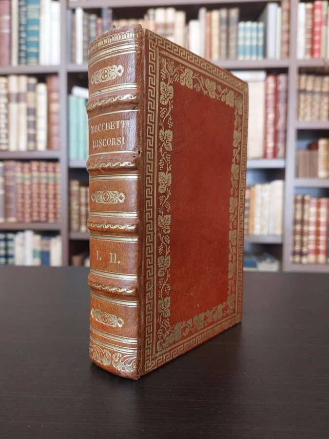 <span style="font-style: normal;">2 volumi in 1 in-16° (cm. 15,8), pp. [4] 237 [3], 213 [3] in ottimo stato con 1 tavola in rame in antiporta (sporadiche fioriture). Legatura con decorazione </span><i>à la vigne</i> che richiama lo stile Bozerian, in pieno vitello con una cornice in oro fiancheggiata da una sequenza continua di foglie di vite impresse a rotella, titolo e fregi in oro al dorso, labbri con sobrie decorazioni in oro, tagli dorati, risguardi marmorizzati. Ottimo esemplare. [L]