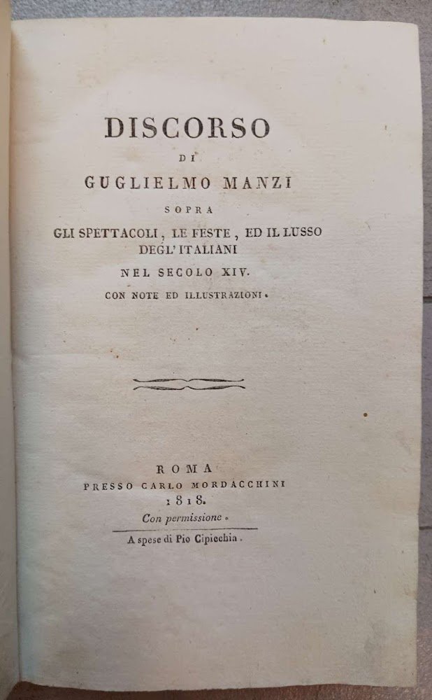 Discorso di Guglielmo Manzi sopra gli Spettacoli, le Feste, ed il Lusso degli Italiani nel secolo XIV. Con note ed illustrazioni.
