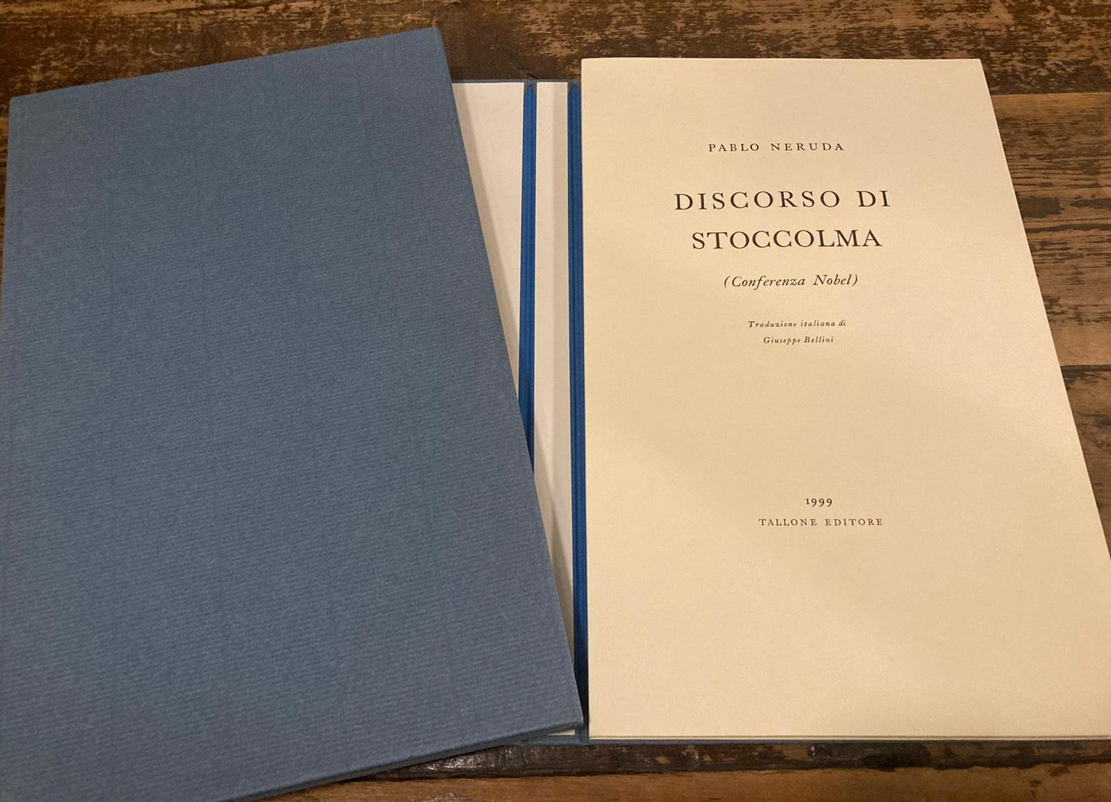 In-4° (297x185mm), pp. 47, (7), brossura editoriale incamiciata crema con titoli in nero al dorso e al piatto anteriore. Cartella e astuccio in cartone rigido azzurro editoriali. Edizione composta a mano con i caratteri Caslon. Ottimo esemplare (n° 33/300) su Magnani Avorio, corredato da un coloratissimo lavoro astratto di Ugo Nespolo fuori testo protetto da velina carta di riso arancione numerato e firmato (n° 33/60). I due discorsi di Neruda per il ricevimento del Nobel per la letteratura; il grande poeta cileno venne insignito due anni prima della morte del Nobel per il complesso della sua opera lirica, divenendo così il terzo scrittore sudamericano a essere insignito del massimo premio letterario del mondo.