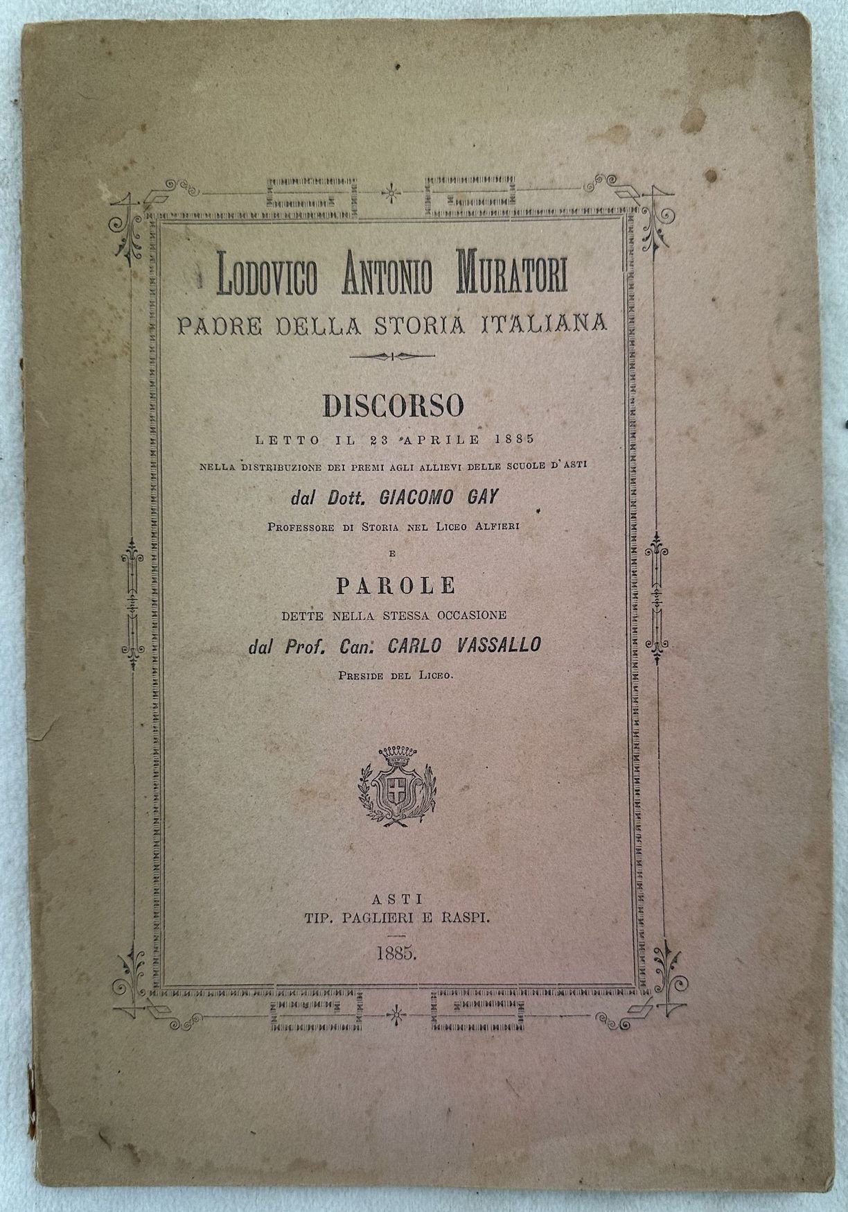 Interessante pubblicazione del 1885 dello storico e scrittore Ludovico Antonio Muratori (1672-1750). Discorso letto il 23 aprile 1885 nella distribuzione dei premi agli allievi delle scuole d'Asti dal Dott. Giacomo Gay e dal Prof. Carlo Vassallo. In buone condizioni. Copertina editoriale in buone condizioni generali con lievi usure ai margini e dorso. Legatura in discrete condizioni con lievi rotture. All'interno le pagine si presentano in buone condizioni con fioriture. In 8. Dim. 23,5x15,5 cm. Pp. 51+(1).Interesting pamphlet of 1885 by the historian and writer Ludovico Antonio Muratori (1672-1750). Speech read the 23rd of april 1885 in the distribution of prizes to the students of Asti by Dott. Giacomo Gay and Prof. Carlo Vassallo. In good conditions. Editorial cover in good general conditions lightly worn in the extremities. Binding in fair conditions with light cracks. Inside pages are in good conditions with foxing. In 8. Dim. 23,5x15,5 cm. Pp. 51+(1).