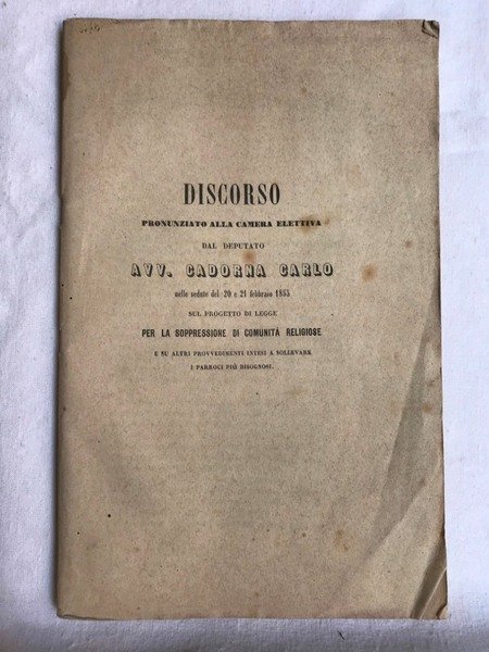 Discorso pronunziato alla Camera elettiva del deputato Avv. Cadorna Carlo nelle sedute del 20 e 21 febbraio 1855 sul PROGETTO DI LEGGE PER LA SOPPRESSIONE DI COMUNITA RELIGIOSE e su altri provvedimenti intesi a sollevare i parroci pi bisognosi.