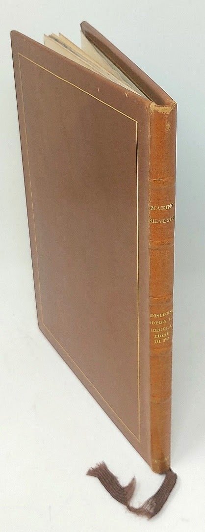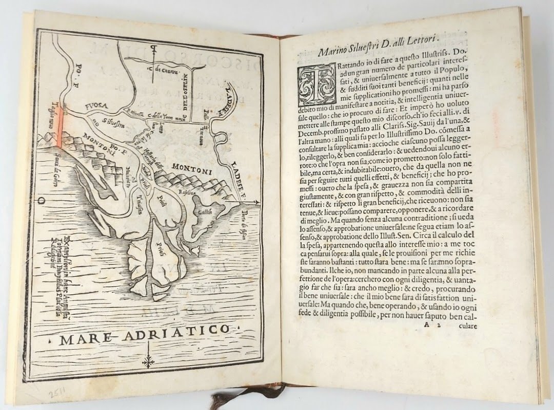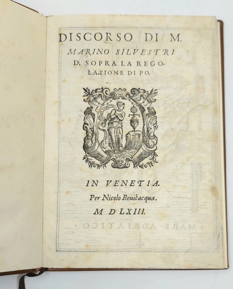 >in-4 piccolo (200x140 mm), ff. (8, ult. b. presente), attraente leg. mod. d'amatore in p. vitello con riquadro a filetto oro sui piatti, dorso a nervi con tit. oro. Impresa tipografica al frontespizio, due iniziali in xilografia, carattere corsivo. Al verso del frontespizio una carta idrografica del delta del Po a piena pag. in xilografia ridotta in questa forma più piccola, come si legge, da Panfilo Placiola; essa ben evidenzia la topografia della zona compresa tra l'Adige e la ''Sacca de Gorro'' con la proposta di nuovi lavori del ''taglio novo'' (qui colorato in rosso). Prima edizione (e probabilmente unica) di questo discorso pronunciato davanti al Consiglio dei Savi del Governo Veneto, col quale il Silvestri (sicuramente un ingegnere idraulico del tempo) si sforza di dimostrare la bontà del proprio progetto di regolazione del Po, le cui inondazioni sono ''causa di tanti danni, che importano più di ducati centomila a l'anno''. Rarissimo. Ottimo esemplare, lievi fioriture al primo foglio. Riccardi II, p. 457. STC 628. Cicogna p. 723 (solo citato).