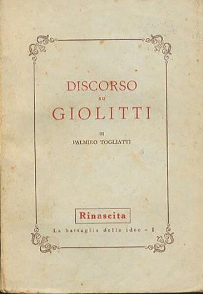 108 p. ; 17 x 11 cm. La battaglia delle idee, 1. Testo di una conferenza di Togliatti su «Giolitti e la democrazia italiana» visti da un punto di vista socialista. Una critica serrata del modello della democrazia liberale e una dichiarazione sul progresso della democrazia che potrà avverarsi solo quando la «classe operaia non si affermi come partecipe della direzione della vita del paese e protagonista di questa». Brossura editoriale, coperta in cartoncino flessibile con titolo impresso al piatto e al dorso. Alcuni leggeri segni del tempo, brevi annotazioni ms. e alcune rare sottolineature, per il resto libro integro. Codice libreria 7530.