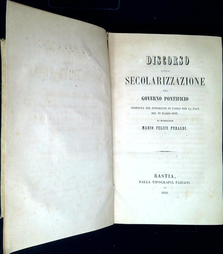 Peraldi, Mario Felice Discorso sulla secolarizzazione del governo pontificio : proposta nel congresso di Parigi per la pace del 30 marzo 1856. Bastia, dalla tipografia Fabiani 1858, 792 p. ; 23 cm (63997)