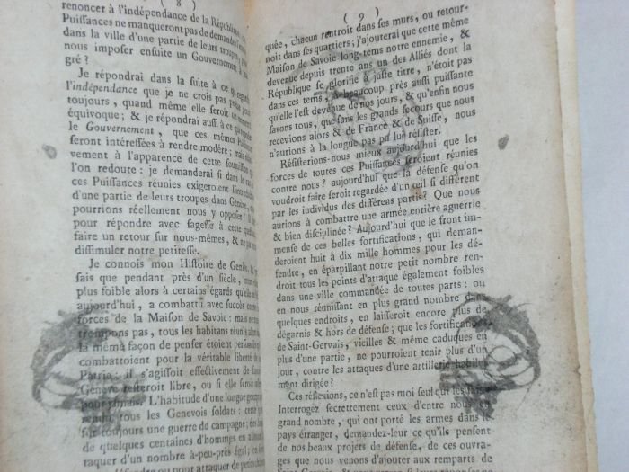 in-8. 14pp. (1f.blanc). Broché. 1er feuillet en partie dérelié. Salissures. Petites mouillures. Rousseurs. Première édition rare. Brochure publiée à l'occasion des troubles politiques qui secouèrent Genève cette année-là entre différentes catégories de la popuplation (les représentants, les négatifs, etc.). L'auteur exhorte ses compatriotes à se tourner vers les puissances extérieures (Zurich, la France, Berne) pour régler le conflit avant qu'elles n'interviennent par la force. Suisse.