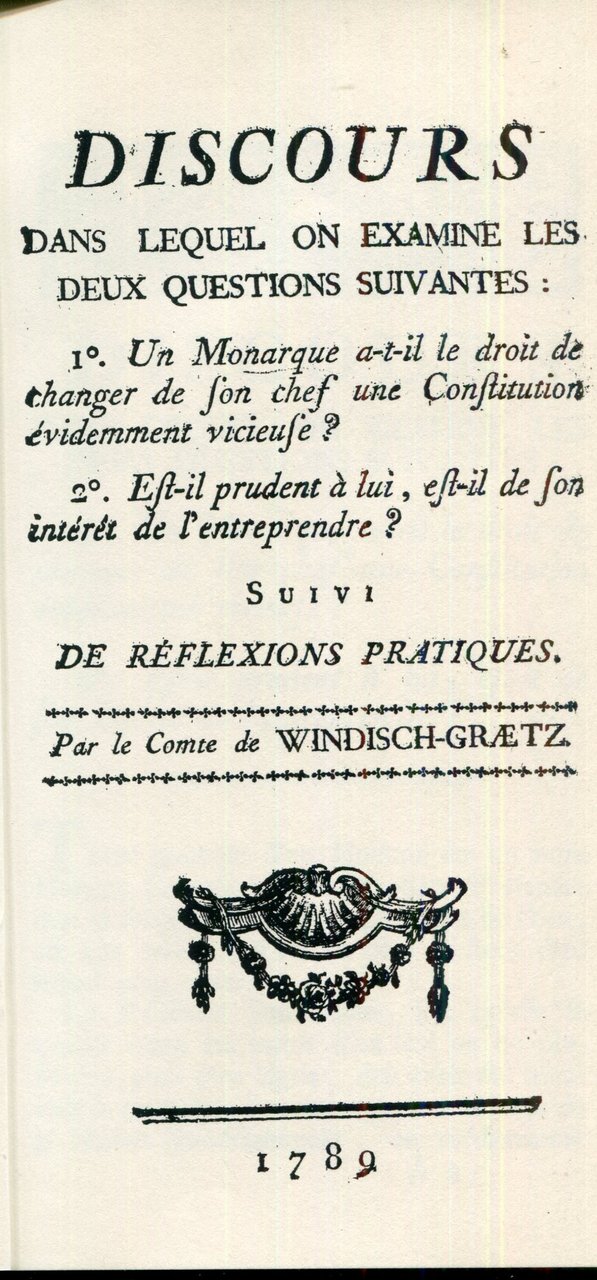 Discours dans lequel on examine les deux questions suivantes: 1º. Un monarque a-t-il le droit de changer de son chef une constitution évidemment vicieuse? 2º. Est-il prudent à lui, est-il de son intérét de l'entreprendre? Suivi de réflexions pratiques. Par le comte de Windisch-Græt. Copia anastatica dell'edizione del 1789