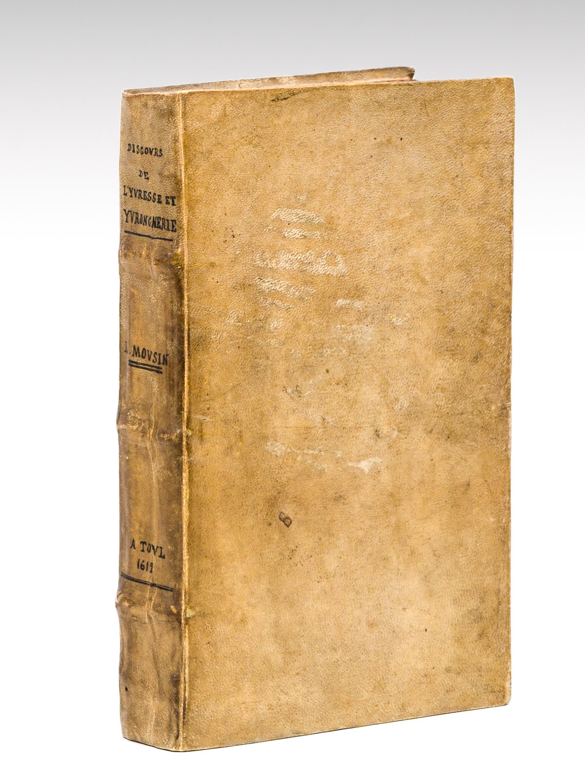 Par I. Mousin, 1 vol. petit in-8 reliure postérieure plein vélin blanc, dos à 3 nerfs, Par Sébastien Philippe, A Toul, 1612, 1 f. blanc, 12 ff. n. ch. (titre, épitre dédicatoire, table, vers adressés à Mousin, extrait du privilège), 390 pp. Très rare exemplaire de l'édition originale. Vicaire cite cet "ouvrage rare", "divisé en 67 chapitres. Mousin fournit un grand nombre de renseignements sur les moeurs épulaires des anciens peuples, sur leurs banquets, sur les vins divers qu'on y servait et sur l'yvresse et ses effets. L'auteur indique ensuite les moyens de se préserver de ce vice et de guérir les ivrognes." Bon état (reliure postérieure, 4 ff. faibles, petit ex-libris ms. en titre). Vicaire, 611