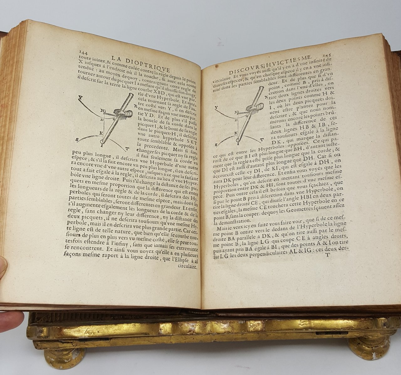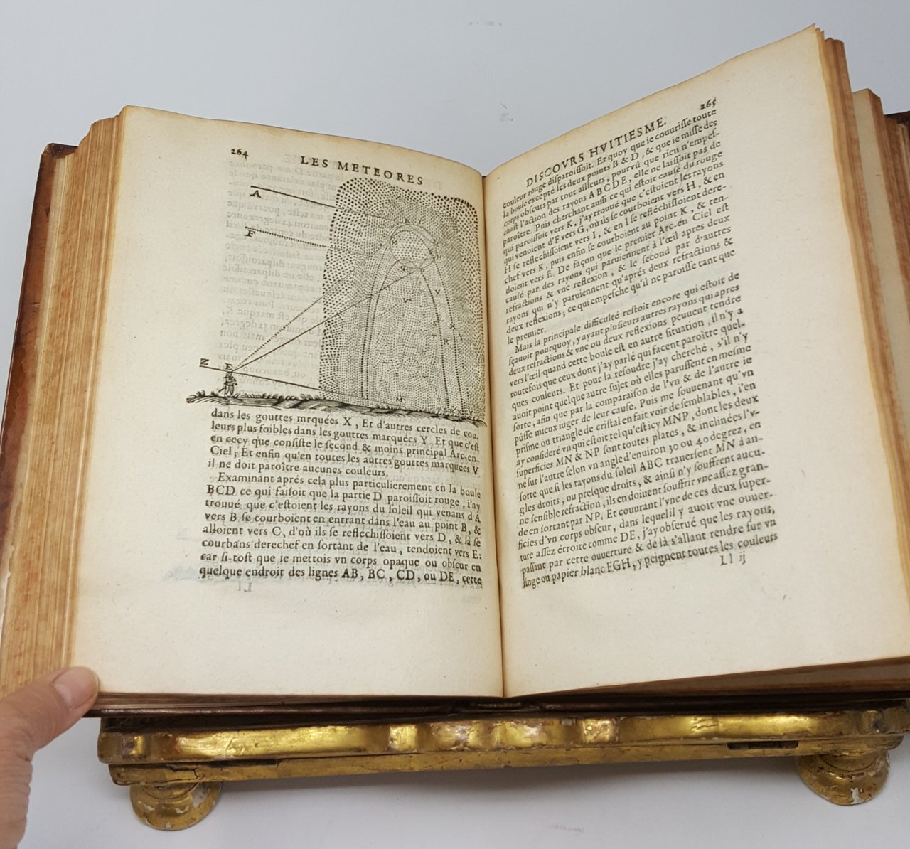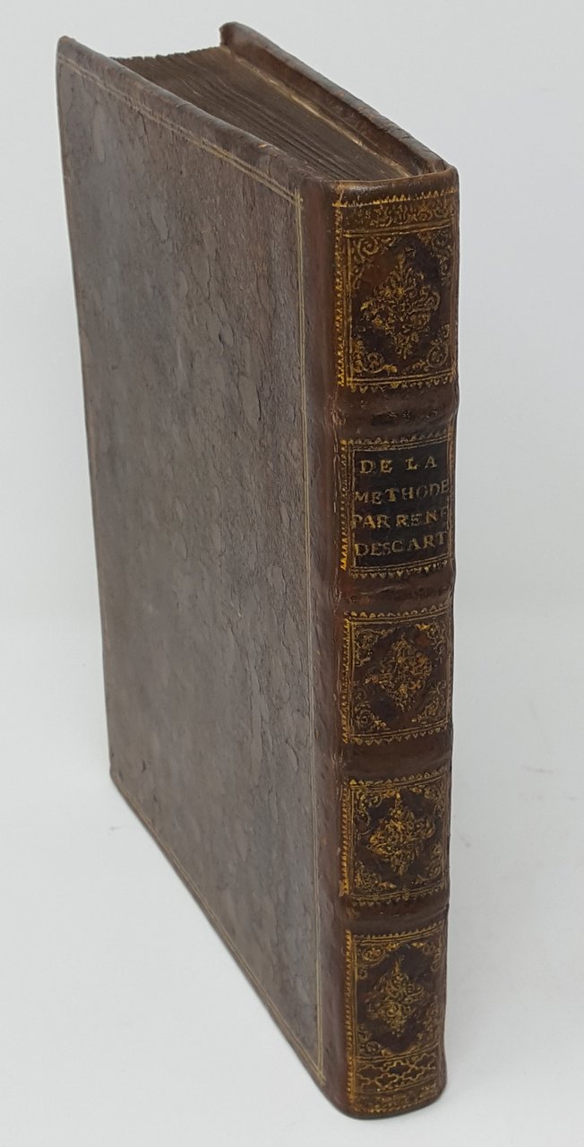 >in-4, 2 parti in un volume, pp.303, (23) per la prima parte (''Discours de la Méthode. La Dioptrique. Les Meteores''); pp. 127, (1), per la seconda parte (''Traité de la Mechanique. Abbregé de la Musique''). Impresa dello stampatore Angot sul titolo, iniziali e finalini di pagina istoriati. Nel testo numerose figure scientifiche di grande interesse. Ottima legatura coeva in piena pelle marmorizzata, doppio filetto oro sui piatti, abilmente rifatte le cerniere e le cuffie , dorso con titolo e fregi oro. Buon esemplare di questa ottima rara edizione, la prima che riunisca tutti i trattati del grande filosofo e scienziato francese (1596-1650), il quale dedicò la vita al progresso di queste scienze e ne fu il ''moderno'' innovatore: il suo ''Discours' (scritto in Olanda ove il libero pensiero era maggiormente autorizzato, ivi pubblicato per la prima volta nel 1637, prezioso e rarissimo), fu la base dei suoi studi in vari campi. Il ragionamento e la verità del pensiero umano (''cogito, ergo sum'') portarono, in seguito, alle importanti scoperte fatte da Locke, Leibnitz e Newton. Esemplare con buoni margini e fresco. Horblit, n.24 ''fundamental work in philosophy and on the method of science…''. Dibner, 81. Printing and the mind of man, 129.