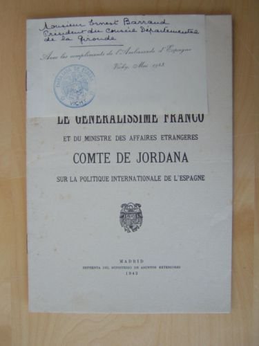 1 brochure 1 in-8 agrafée, Imprenta del Ministerio de Asuntos Exteriores, Madrid, 1943, 8 pp. Avec un billet d'envoi de l'Ambassade d'Espagne à Vichy, à l'attention du président du conseil départemental de la Gironde (Mai 1943). Rare et intéressante brochure. Etat très satisfaisant.