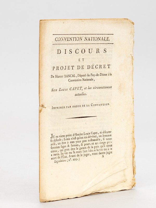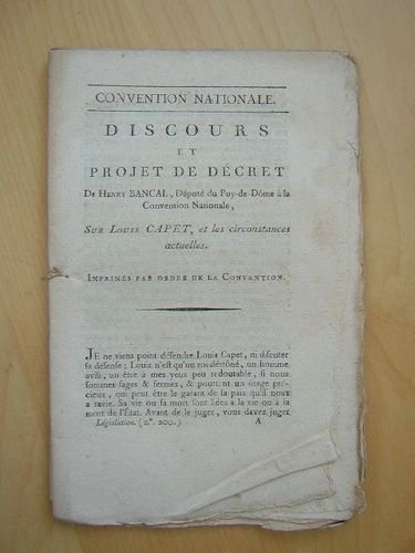 Discours et Projet de Décret de Henry Bancal, Député du Puy-de-Dôme à la Convention Nationale, sur Louis Capet, et les circonstances actuelles. ; Imprimé par Ordre de la Convention, 1 brochure in-8, De l'Imprimerie Nationale, (Paris), s.d., 32 pp. Edition originale. Etat très satisfaisant. Peu courant.